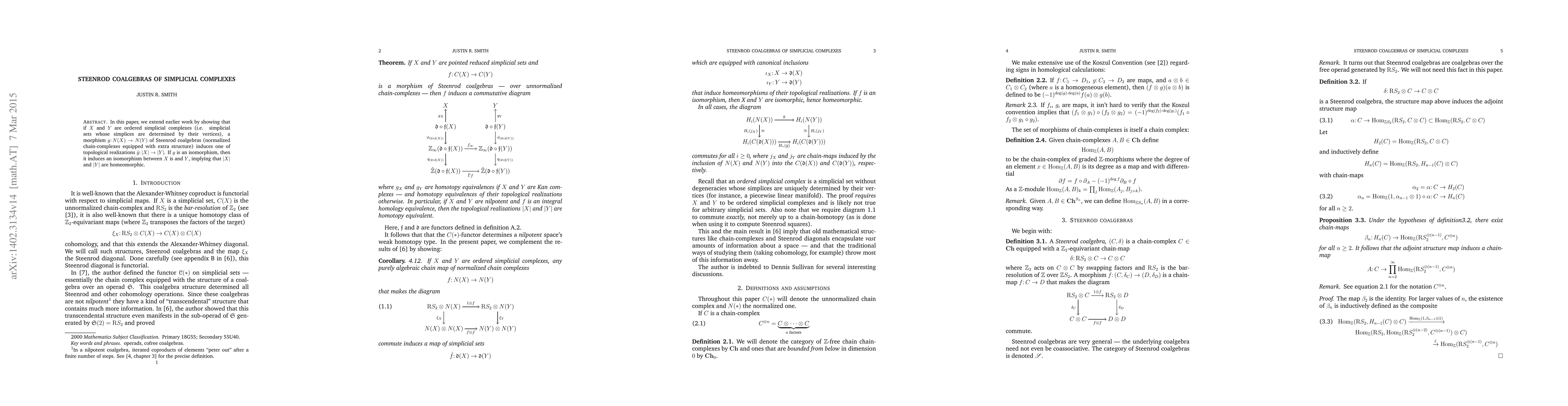 In this paper, we extend earlier work by showing that if $X$ and $Y$ are simplicial complexes (i.e. simplicial sets whose simplices are determined by their vertices), a morphism $g:N(X)\to N(Y)$ of Steenrod coalgebras (normalized chain-complexes equipped with extra structure) induces one of their topological realizations $\hat{g}:|X|\to |Y|$. If $g$ is an isomorphism, then it induces an isomorphism between $X$ and $Y$, implying that they are homeomorphic.
