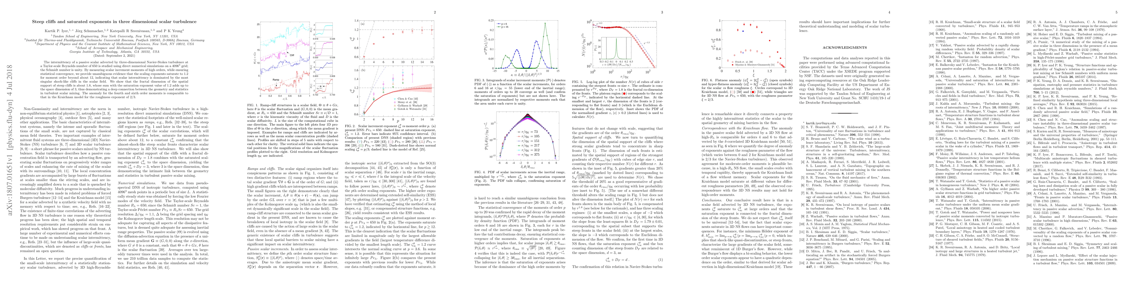 This paper investigates the intermittency in three-dimensional scalar turbulence, revealing that scaling exponents saturate at $1.2$ for high-order moments, indicating dominance by singular shock-like cliffs. The fractal dimension of these cliffs is found to be $1.8$, linking geometry and statistics in turbulent mixing.