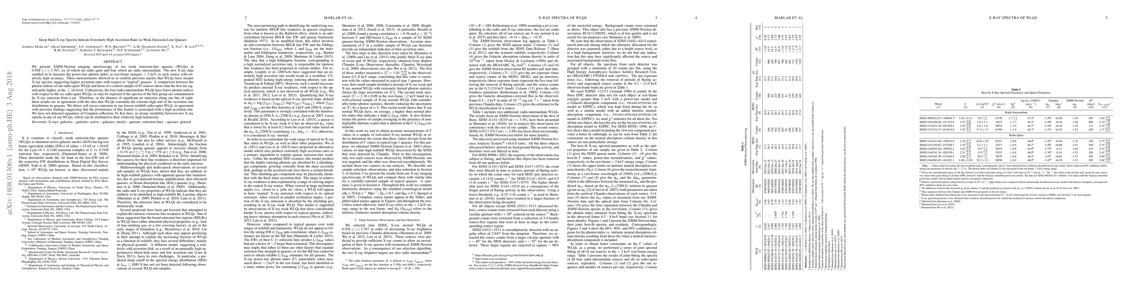 This study uses XMM-Newton data to analyze X-ray spectra of ten weak emission-line quasars (WLQs), finding steeper hard-X-ray spectra indicative of extremely high accretion rates compared to typical quasars. Radio-quiet WLQs show significantly higher photon indices, suggesting they represent the extreme end of the quasar accretion rate distribution.