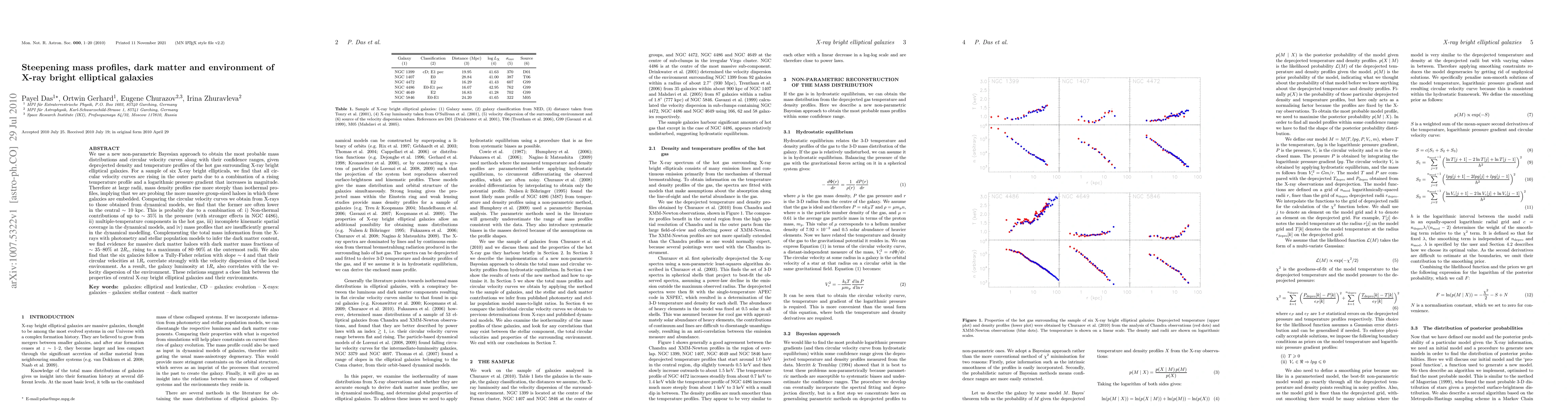 This study employs a non-parametric Bayesian method to derive mass distributions and velocity curves for six X-ray bright elliptical galaxies, revealing rising circular velocities in the outer regions due to rising temperature profiles and pressure gradients. The analysis suggests significant dark matter halos, with mass fractions of 35-80% at 2Re, and a strong correlation between galaxy luminosity and local environment velocity dispersion.