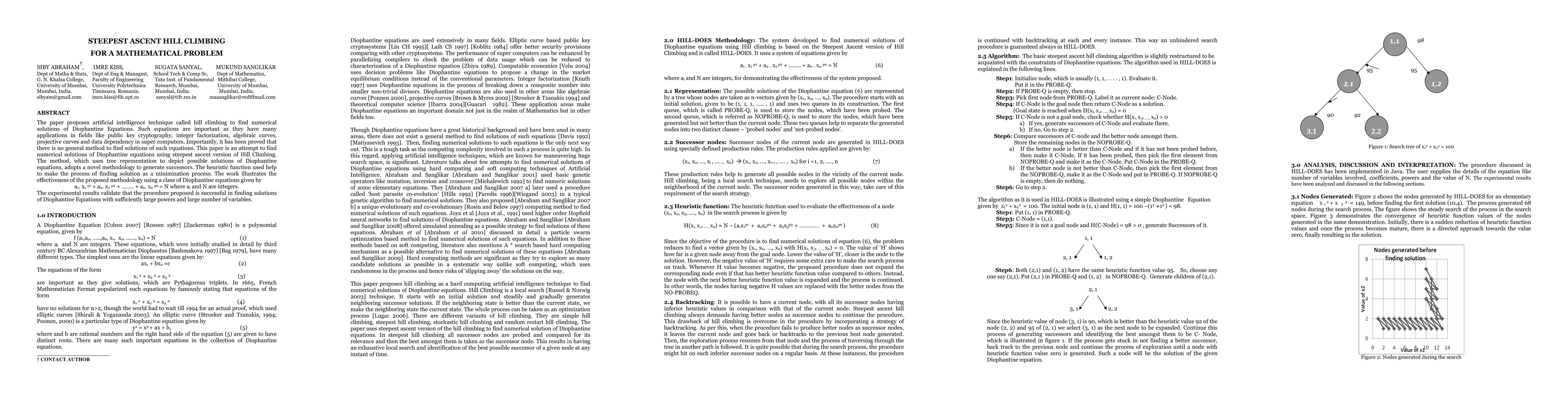The paper proposes artificial intelligence technique called hill climbing to find numerical solutions of Diophantine Equations. Such equations are important as they have many applications in fields like public key cryptography, integer factorization, algebraic curves, projective curves and data dependency in super computers. Importantly, it has been proved that there is no general method to find solutions of such equations. This paper is an attempt to find numerical solutions of Diophantine equations using steepest ascent version of Hill Climbing. The method, which uses tree representation to depict possible solutions of Diophantine equations, adopts a novel methodology to generate successors. The heuristic function used help to make the process of finding solution as a minimization process. The work illustrates the effectiveness of the proposed methodology using a class of Diophantine equations given by a1. x1 p1 + a2. x2 p2 + ...... + an . xn pn = N where ai and N are integers. The experimental results validate that the procedure proposed is successful in finding solutions of Diophantine Equations with sufficiently large powers and large number of variables.