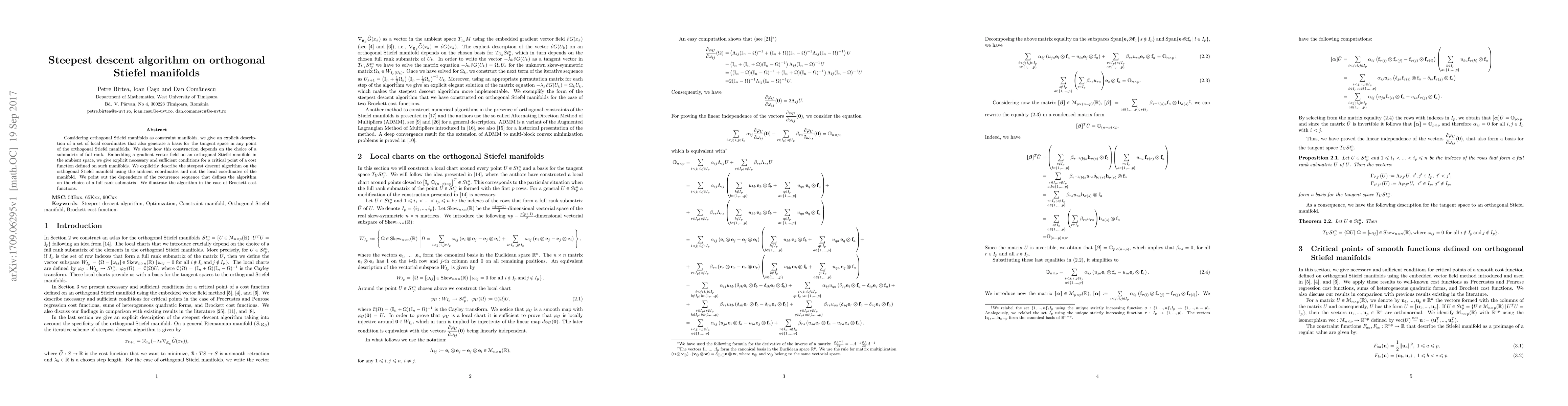 This paper develops a steepest descent algorithm for optimization on orthogonal Stiefel manifolds, providing explicit local coordinates and conditions for critical points. It describes the algorithm in ambient coordinates and highlights its dependence on the choice of a full rank submatrix, with an illustration using Brockett cost functions.