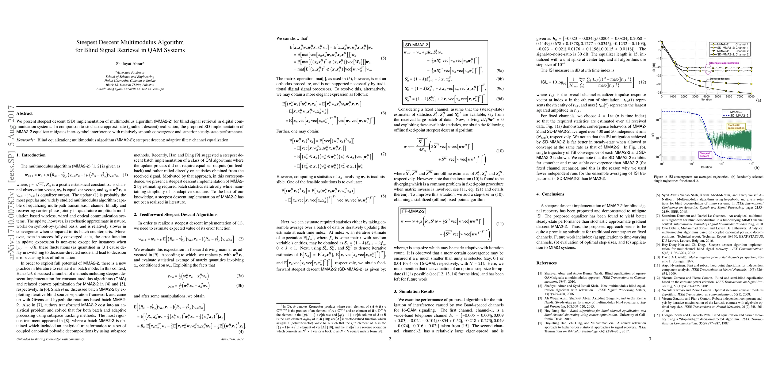 Summary: This paper proposes a steepest descent implementation of the multimodulus algorithm for blind signal retrieval in QAM systems, which offers smoother convergence and better steady-state performance compared to stochastic gradient descent methods, effectively mitigating inter-symbol interference.