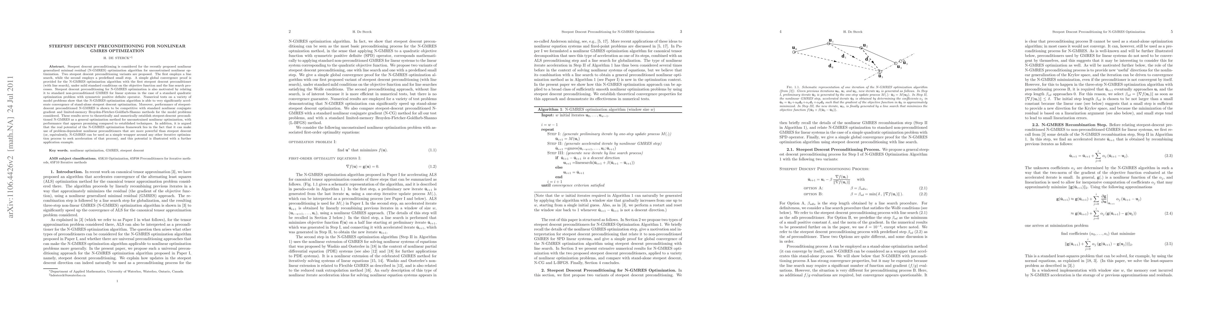 This paper proposes steepest descent preconditioning variants for the nonlinear generalized minimal residual (N-GMRES) optimization algorithm, demonstrating significant acceleration in convergence compared to standalone steepest descent. The method is shown to be competitive with established nonlinear optimization techniques, highlighting its potential for broader application.