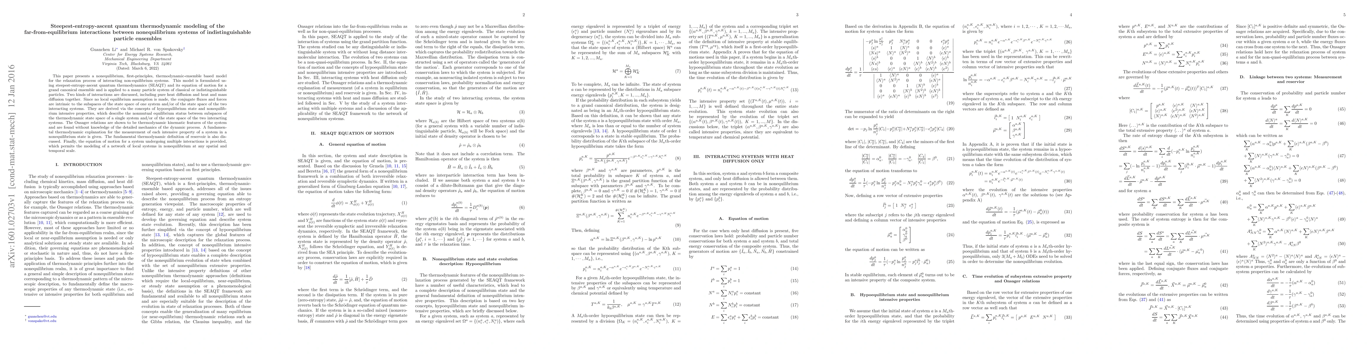 This paper presents a nonequilibrium, first-principles, thermodynamic-ensemble based model for the relaxation process of interacting non-equilibrium systems. This model is formulated using steepest-entropy-ascent quantum thermodynamics (SEAQT) and its equation of motion for a grand canonical ensemble and is applied to a many particle system of classical or indistinguishable particles. Two kinds of interactions are discussed, including pure heat diffusion and heat and mass diffusion together. Since no local equilibrium assumption is made, the conjugate fluxes and forces are intrinsic to the subspaces of the state space of one system and/or of the state space of the two interacting systems. They are derived via the concepts of hypoequilibrium state and nonequilibrium intensive properties, which describe the nonmutual equilibrium status between subspaces of the thermodynamic state space of a single system and/or of the state space of the two interacting systems. The Onsager relations are shown to be thermodynamic kinematic features of the system and are found without knowledge of the detailed mechanics of the dynamic process. A fundamental thermodynamic explanation for the measurement of each intensive property of a system in a nonequilibrium state is given. The fundamental thermodynamic definition of reservoir is also discussed. Finally, the equation of motion for a system undergoing multiple interactions is provided, which permits the modeling of a network of local systems in nonequilibrium at any spatial and temporal scale.