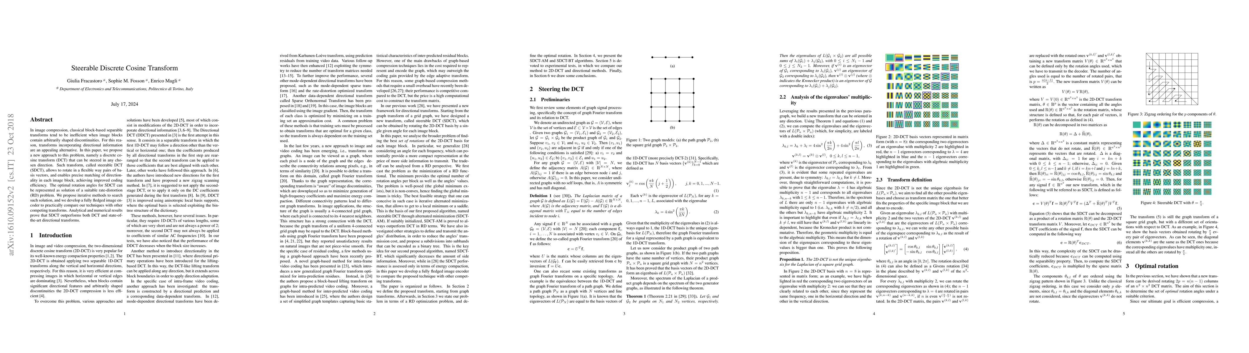 This paper proposes a steerable discrete cosine transform (SDCT) that can rotate basis vectors flexibly to match image block discontinuities better, achieving higher coding efficiency. The optimal rotation angles are derived from a rate-distortion problem, and iterative methods are developed for practical implementation, showing superior performance over traditional DCT and other directional transforms.