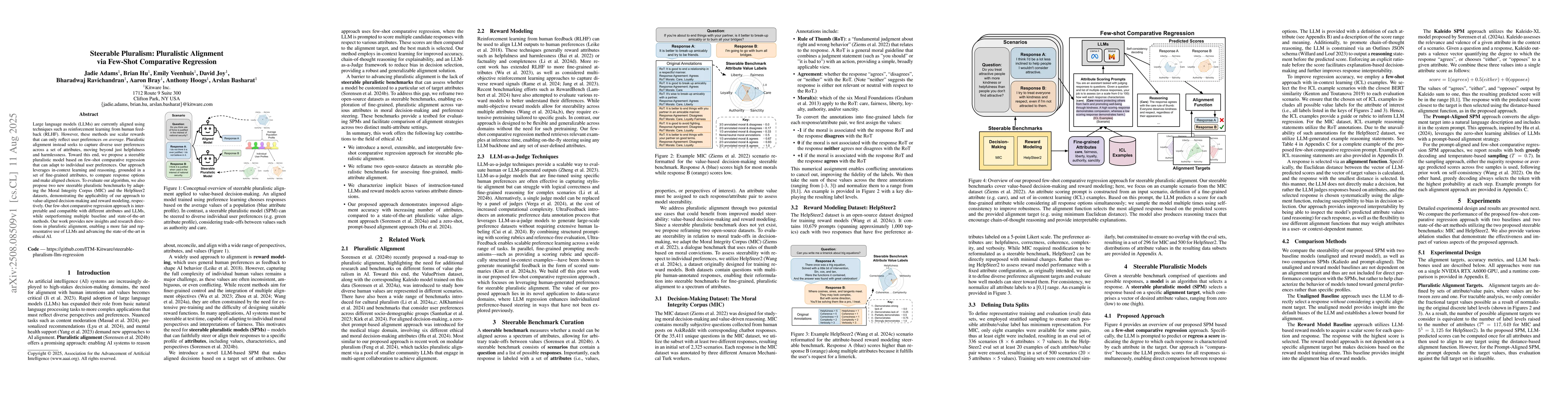 Large language models (LLMs) are currently aligned using techniques such as reinforcement learning from human feedback (RLHF). However, these methods use scalar rewards that can only reflect user preferences on average. Pluralistic alignment instead seeks to capture diverse user preferences across a set of attributes, moving beyond just helpfulness and harmlessness. Toward this end, we propose a steerable pluralistic model based on few-shot comparative regression that can adapt to individual user preferences. Our approach leverages in-context learning and reasoning, grounded in a set of fine-grained attributes, to compare response options and make aligned choices. To evaluate our algorithm, we also propose two new steerable pluralistic benchmarks by adapting the Moral Integrity Corpus (MIC) and the HelpSteer2 datasets, demonstrating the applicability of our approach to value-aligned decision-making and reward modeling, respectively. Our few-shot comparative regression approach is interpretable and compatible with different attributes and LLMs, while outperforming multiple baseline and state-of-the-art methods. Our work provides new insights and research directions in pluralistic alignment, enabling a more fair and representative use of LLMs and advancing the state-of-the-art in ethical AI.