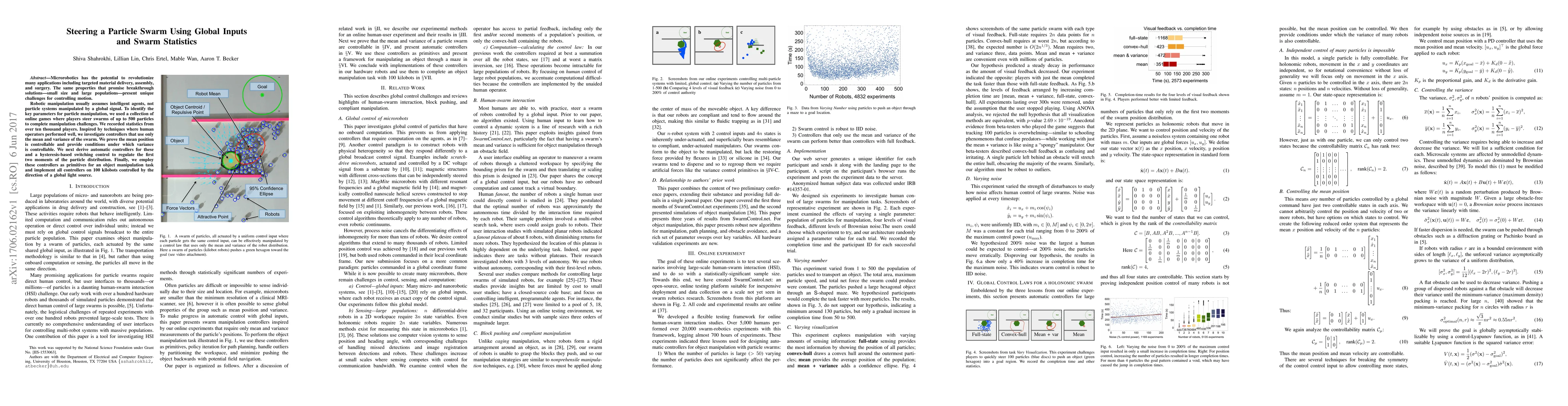 Microrobotics has the potential to revolutionize many applications including targeted material delivery, assembly, and surgery. The same properties that promise breakthrough solutions---small size and large populations---present unique challenges for controlling motion. Robotic manipulation usually assumes intelligent agents, not particle systems manipulated by a global signal. To identify the key parameters for particle manipulation, we used a collection of online games where players steer swarms of up to 500 particles to complete manipulation challenges. We recorded statistics from over ten thousand players. Inspired by techniques where human operators performed well, we investigate controllers that use only the mean and variance of the swarm. We prove the mean position is controllable and provide conditions under which variance is controllable. We next derive automatic controllers for these and a hysteresis-based switching control to regulate the first two moments of the particle distribution. Finally, we employ these controllers as primitives for an object manipulation task and implement all controllers on 100 kilobots controlled by the direction of a global light source.