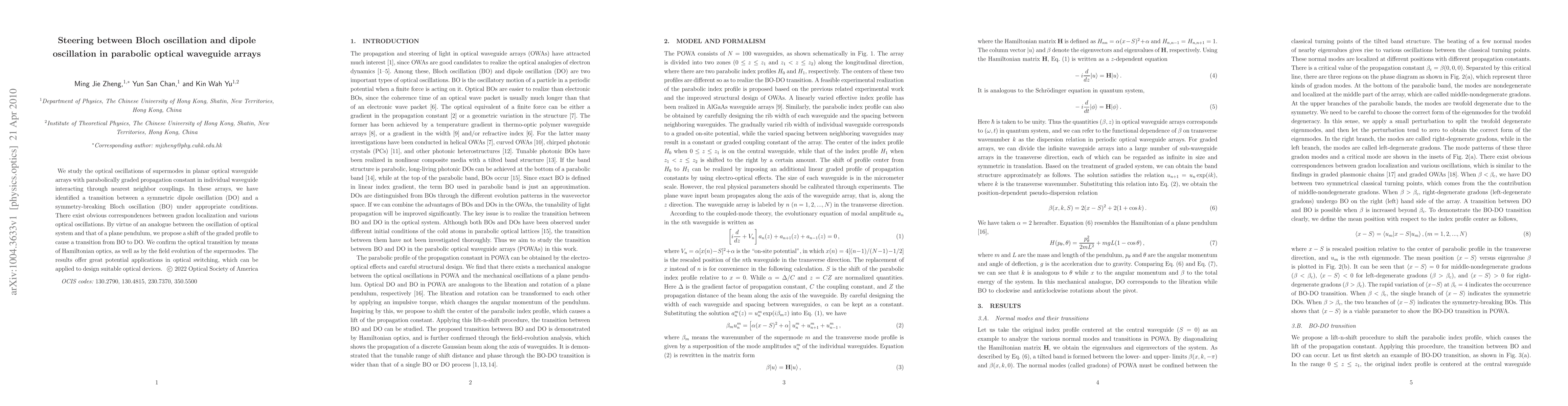 This paper explores optical oscillations in parabolic optical waveguide arrays, identifying a transition from Bloch oscillation to dipole oscillation under specific conditions. The study confirms this transition via Hamiltonian optics and field evolution, suggesting potential applications in optical switching and device design.
