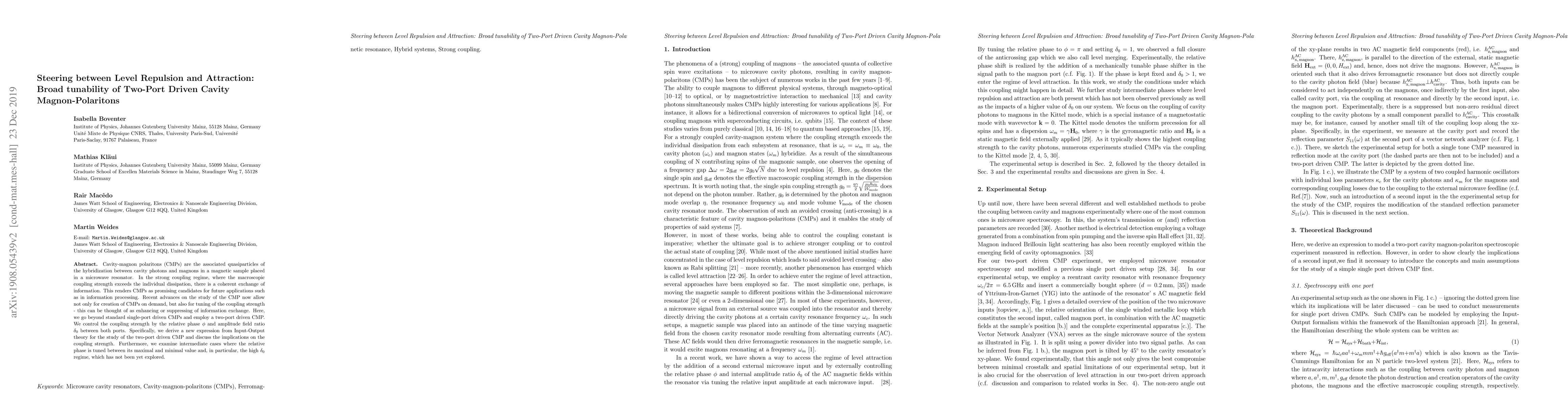 This research introduces a two-port driven cavity-magnon polariton (CMP) system, expanding on single-port models. By controlling the relative phase and amplitude field ratio between ports, the coupling strength is tunable, enabling manipulation of information exchange. The study derives a new expression from Input-Output theory and explores previously unexamined regimes, advancing CMPs for potential information processing applications.
