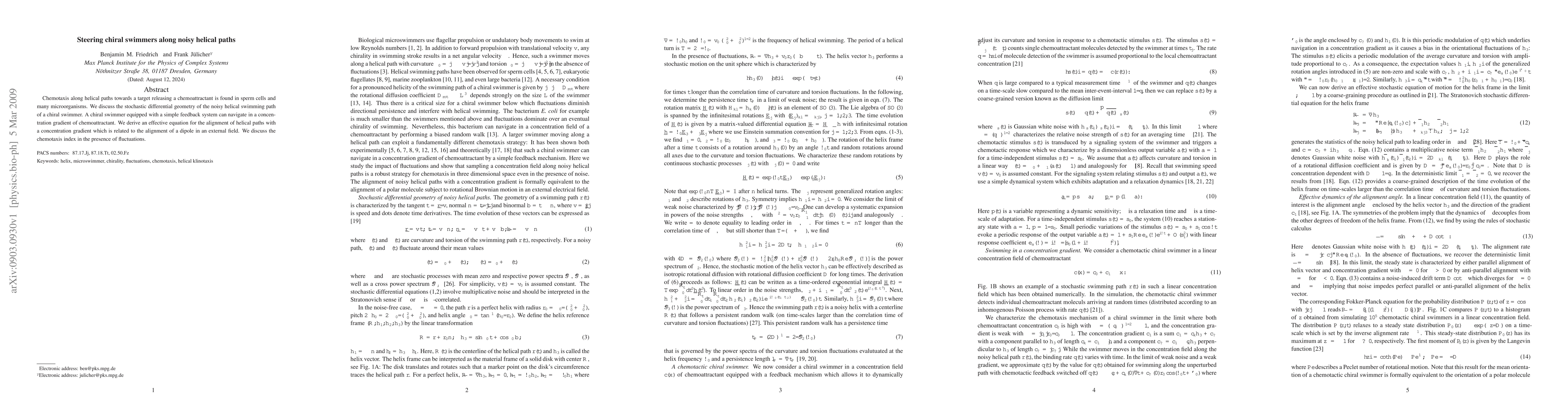 Chemotaxis along helical paths towards a target releasing a chemoattractant is found in sperm cells and many microorganisms. We discuss the stochastic differential geometry of the noisy helical swimming path of a chiral swimmer. A chiral swimmer equipped with a simple feedback system can navigate in a concentration gradient of chemoattractant. We derive an effective equation for the alignment of helical paths with a concentration gradient which is related to the alignment of a dipole in an external field. We discuss the chemotaxis index in the presence of fluctuations.