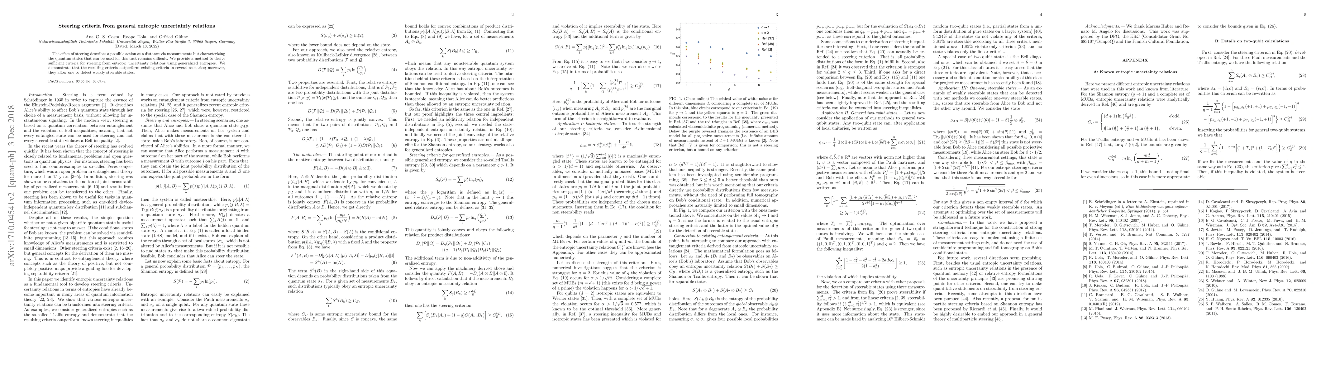 The effect of steering describes a possible action at a distance via measurements but characterizing the quantum states that can be used for this task remains difficult. We provide a method to derive sufficient criteria for steering from entropic uncertainty relations using generalized entropies. We demonstrate that the resulting criteria outperform existing criteria in several scenarios; moreover, they allow one to detect weakly steerable states.