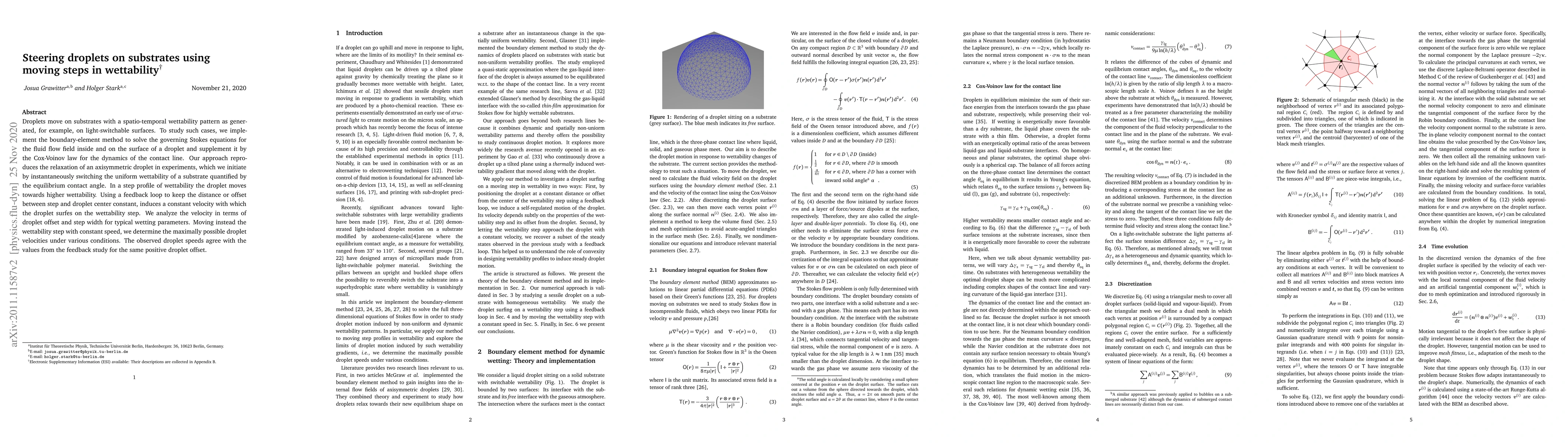 This research explores droplet movement on substrates with dynamically changing wettability, using a boundary-element method to model fluid flow and contact line dynamics. It demonstrates how a droplet can surf on a moving wettability step, achieving constant velocities by maintaining a fixed offset, and identifies optimal speeds for different conditions.