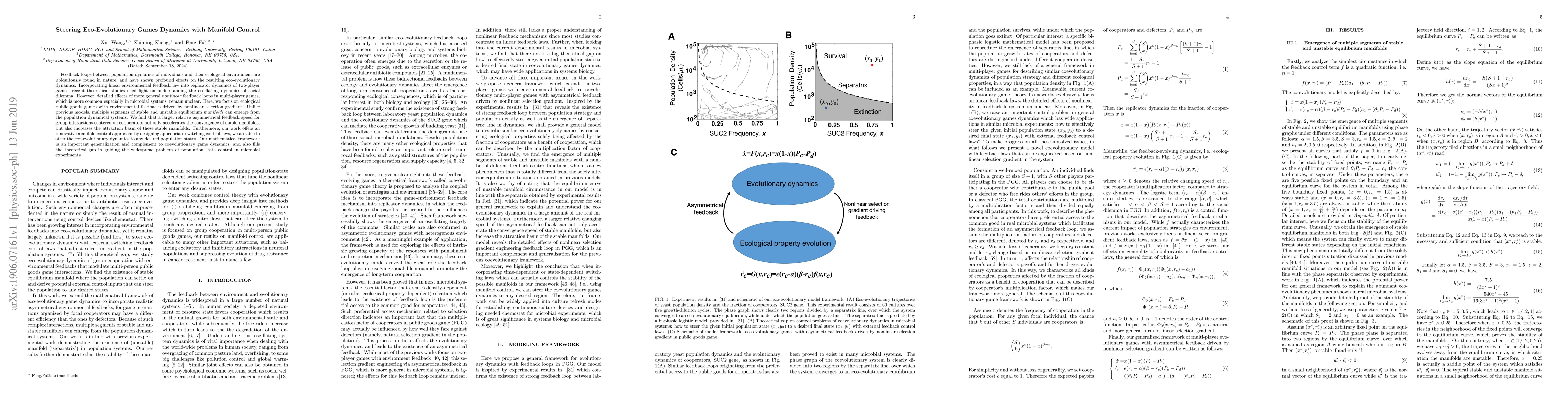 Feedback loops between population dynamics of individuals and their ecological environment are ubiquitously found in nature, and have shown profound effects on the resulting eco-evolutionary dynamics. Incorporating linear environmental feedback law into replicator dynamics of two-player games, recent theoretical studies shed light on understanding the oscillating dynamics of social dilemma. However, detailed effects of more general nonlinear feedback loops in multi-player games, which is more common especially in microbial systems, remain unclear. Here, we focus on ecological public goods games with environmental feedbacks driven by nonlinear selection gradient. Unlike previous models, multiple segments of stable and unstable equilibrium manifolds can emerge from the population dynamical systems. We find that a larger relative asymmetrical feedback speed for group interactions centered on cooperators not only accelerates the convergence of stable manifolds, but also increases the attraction basin of these stable manifolds. Furthermore, our work offers an innovative manifold control approach: by designing appropriate switching control laws, we are able to steer the eco-evolutionary dynamics to any desired population states. Our mathematical framework is an important generalization and complement to coevolutionary game dynamics, and also fills the theoretical gap in guiding the widespread problem of population state control in microbial experiments.