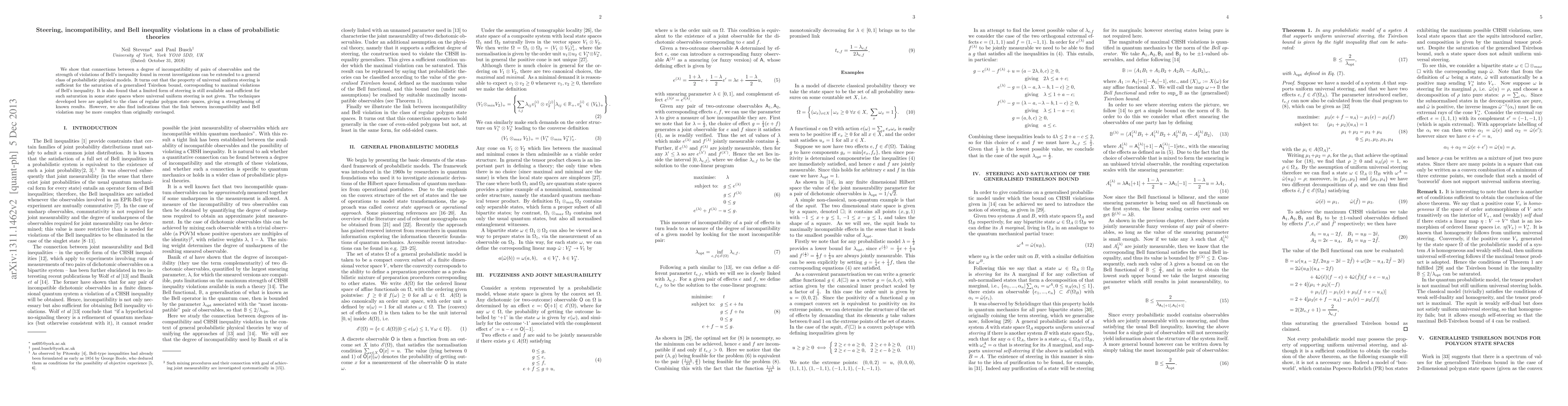This paper explores the relationship between the incompatibility of observables and Bell inequality violations in a broad class of probabilistic theories, demonstrating that universal uniform steering is sufficient for maximal Bell inequality violations, while limited steering suffices in some cases. The study applies these findings to regular polygon state spaces, revealing a more intricate link between incompatibility and Bell violation than previously thought.