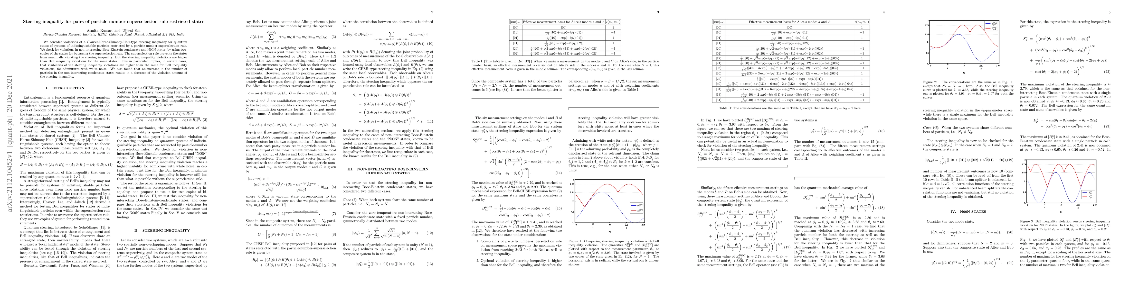We consider violations of a Clauser-Horne-Shimony-Holt-type steering inequality for quantum states of systems of indistinguishable particles restricted by a particle-number-superselection rule. We check for violations in non-interacting Bose-Einstein condensate and N00N states, by using two copies of the states for bypassing the superselection rule. The superselection rule prevents the states from maximally violating the steering inequality. But the steering inequality violations are higher than Bell inequality violations for the same states. This in particular implies, in certain cases, that visibilities of the steering inequality violations are higher than the same for Bell inequality violations, for admixtures with white noise. We also found that an increase in the number of particles in the non-interacting condensate states results in a decrease of the violation amount of the steering inequality.