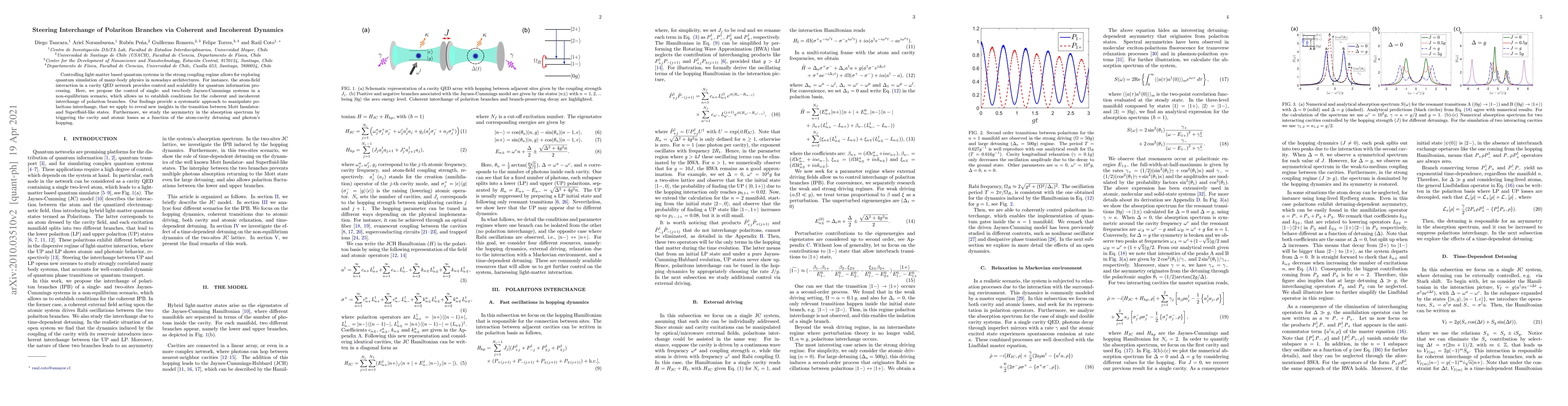 Controlling light-matter based quantum systems in the strong coupling regime allows for exploring quantum simulation of many-body physics in nowadays architectures. For instance, the atom-field interaction in a cavity QED network provides control and scalability for quantum information processing. Here, we propose the control of single- and two-body Jaynes-Cummings systems in a non-equilibrium scenario, which allows us to establish conditions for the coherent and incoherent interchange of polariton branches. Our findings provide a systematic approach to manipulate polaritons interchange, that we apply to reveal new insights in the transition between Mott Insulator- and Superfluid-like states. Furthermore, we study the asymmetry in the absorption spectrum by triggering the cavity and atomic losses as a function of the atom-cavity detuning and photon's hopping.