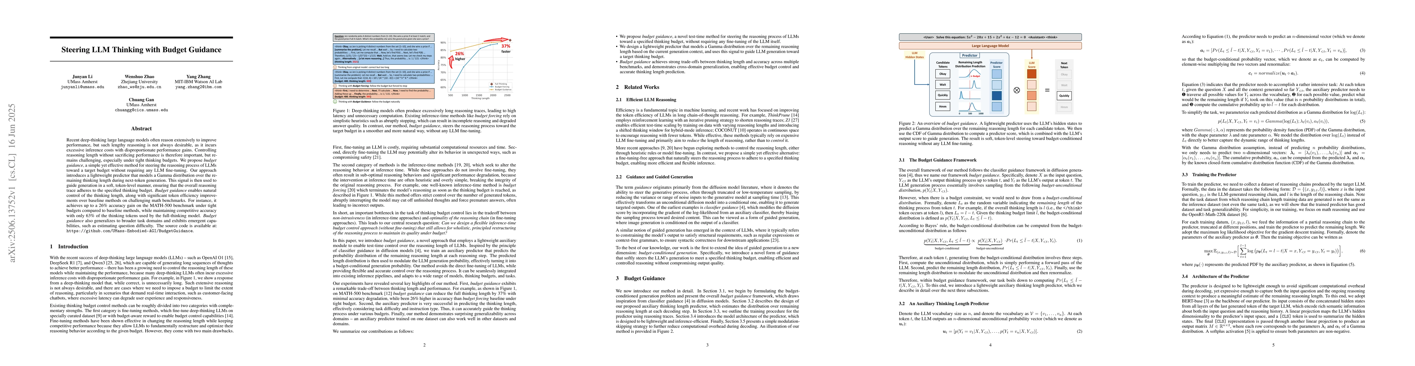 Recent deep-thinking large language models often reason extensively to improve performance, but such lengthy reasoning is not always desirable, as it incurs excessive inference costs with disproportionate performance gains. Controlling reasoning length without sacrificing performance is therefore important, but remains challenging, especially under tight thinking budgets. We propose budget guidance, a simple yet effective method for steering the reasoning process of LLMs toward a target budget without requiring any LLM fine-tuning. Our approach introduces a lightweight predictor that models a Gamma distribution over the remaining thinking length during next-token generation. This signal is then used to guide generation in a soft, token-level manner, ensuring that the overall reasoning trace adheres to the specified thinking budget. Budget guidance enables natural control of the thinking length, along with significant token efficiency improvements over baseline methods on challenging math benchmarks. For instance, it achieves up to a 26% accuracy gain on the MATH-500 benchmark under tight budgets compared to baseline methods, while maintaining competitive accuracy with only 63% of the thinking tokens used by the full-thinking model. Budget guidance also generalizes to broader task domains and exhibits emergent capabilities, such as estimating question difficulty. The source code is available at: https://github.com/UMass-Embodied-AGI/BudgetGuidance.