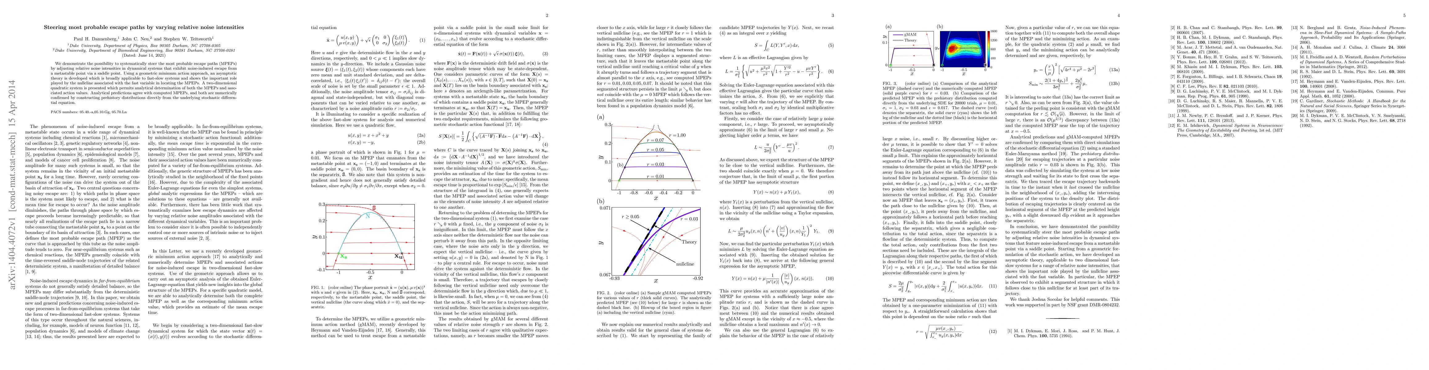This paper presents a method to steer the most probable escape paths in dynamical systems using varying relative noise intensities, employing a geometric minimum action approach. Analytical and numerical results confirm the effectiveness of this method in fast-slow systems, highlighting the role of the nullcline associated with the fast variable.