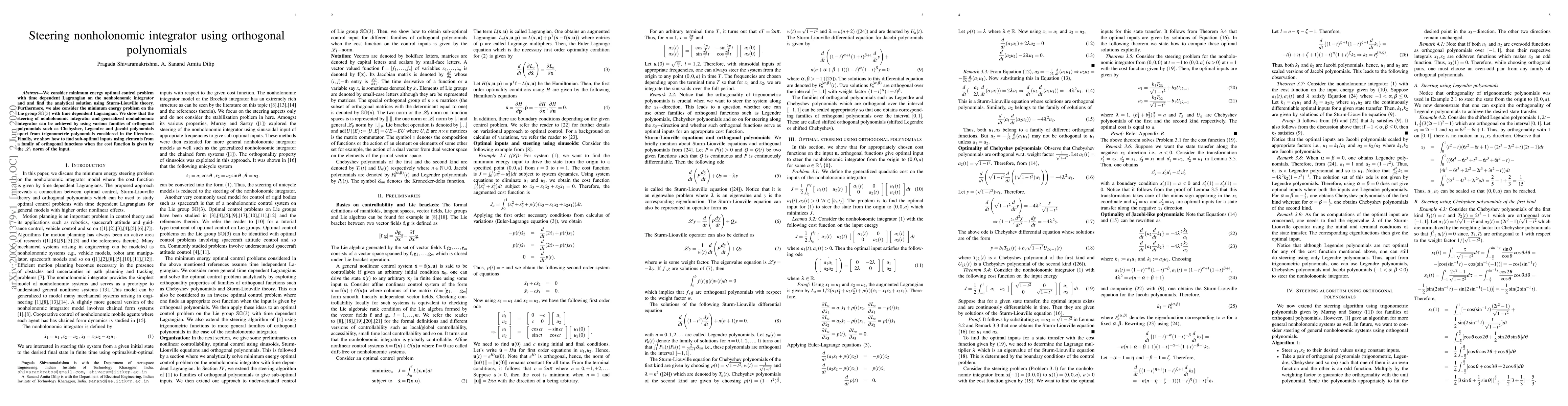We consider minimum energy optimal control problem with time dependent Lagrangian on the nonholonomic integrator and and find the analytical solution using Sturm-Liouville theory. Furthermore, we also consider the minimum energy problem on the Lie group $\mathbb{SO}(3)$ with time dependent Lagrangian. We show that the steering of nonholonomic integrator and generalized nonholonomic integrator can be achieved by using various families of orthogonal polynomials such as Chebyshev, Legendre and Jacobi polynomials apart from trigonometric polynomials considered in the literature. Finally, we show how to find sub-optimal inputs using elements from a family of orthogonal functions when the cost function is given by the $\mathcal{L}_1$ norm of the input.