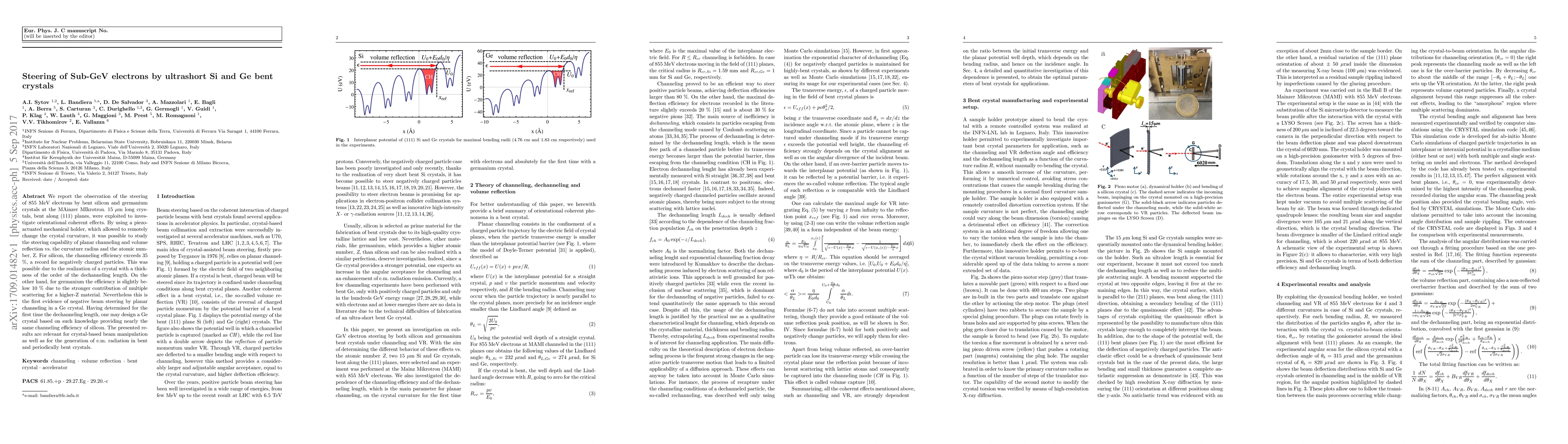 This study demonstrates the steering of 855 MeV electrons by bent silicon and germanium crystals, achieving over 35% channeling efficiency for silicon and showing the first evidence of negative beam steering in germanium. The findings are crucial for crystal-based beam manipulation and the generation of electromagnetic radiation.
