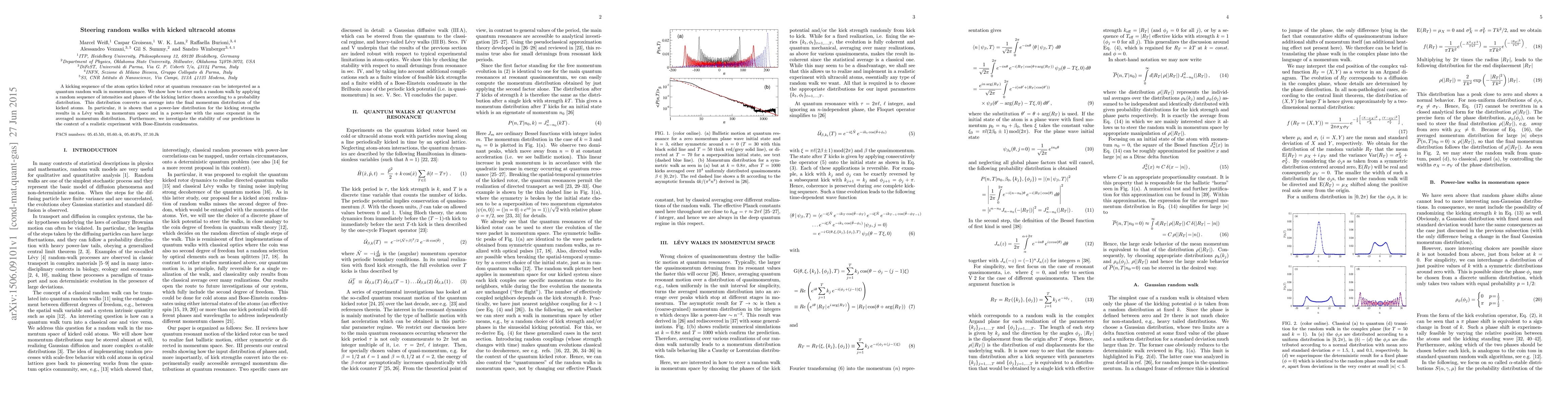 A kicking sequence of the atom optics kicked rotor at quantum resonance can be interpreted as a quantum random walk in momentum space. We show how to steer such a random walk by applying a random sequence of intensities and phases of the kicking lattice chosen according to a probability distribution. This distribution converts on average into the final momentum distribution of the kicked atoms. In particular, it is shown that a power-law distribution for the kicking strengths results in a L\'evy walk in momentum space and in a power-law with the same exponent in the averaged momentum distribution. Furthermore, we investigate the stability of our predictions in the context of a realistic experiment with Bose-Einstein condensates.
