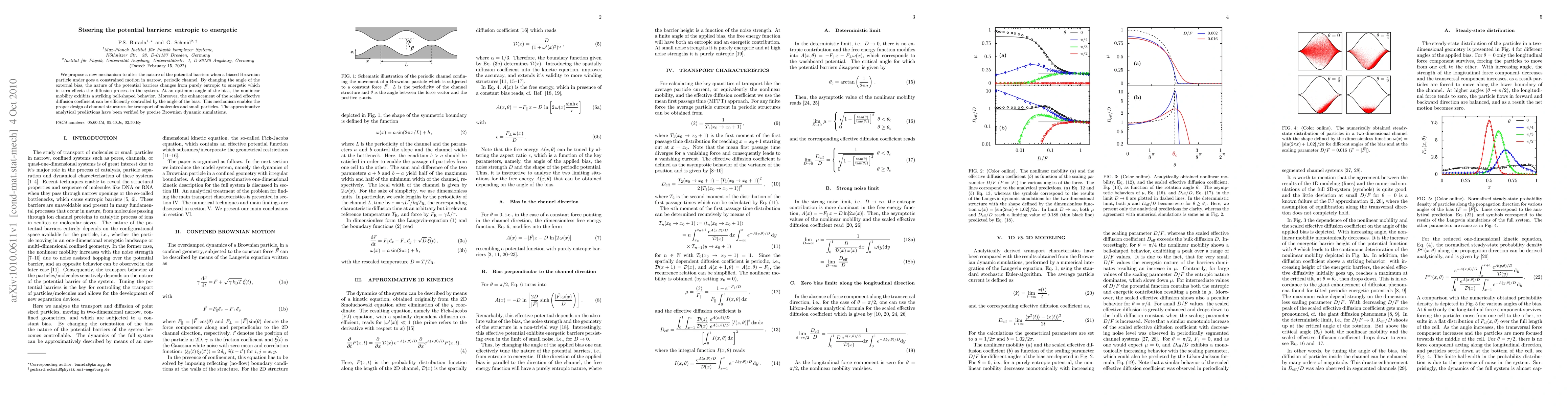 We propose a new mechanism to alter the nature of the potential barriers when a biased Brownian particle under goes a constrained motion in narrow, periodic channel. By changing the angle of the external bias, the nature of the potential barriers changes from purely entropic to energetic which in turn effects the diffusion process in the system. At an optimum angle of the bias, the nonlinear mobility exhibits a striking bell-shaped behavior. Moreover, the enhancement of the scaled effective diffusion coefficient can be efficiently controlled by the angle of the bias. This mechanism enables the proper design of channel structures for transport of molecules and small particles. The approximative analytical predictions have been verified by precise Brownian dynamic simulations.