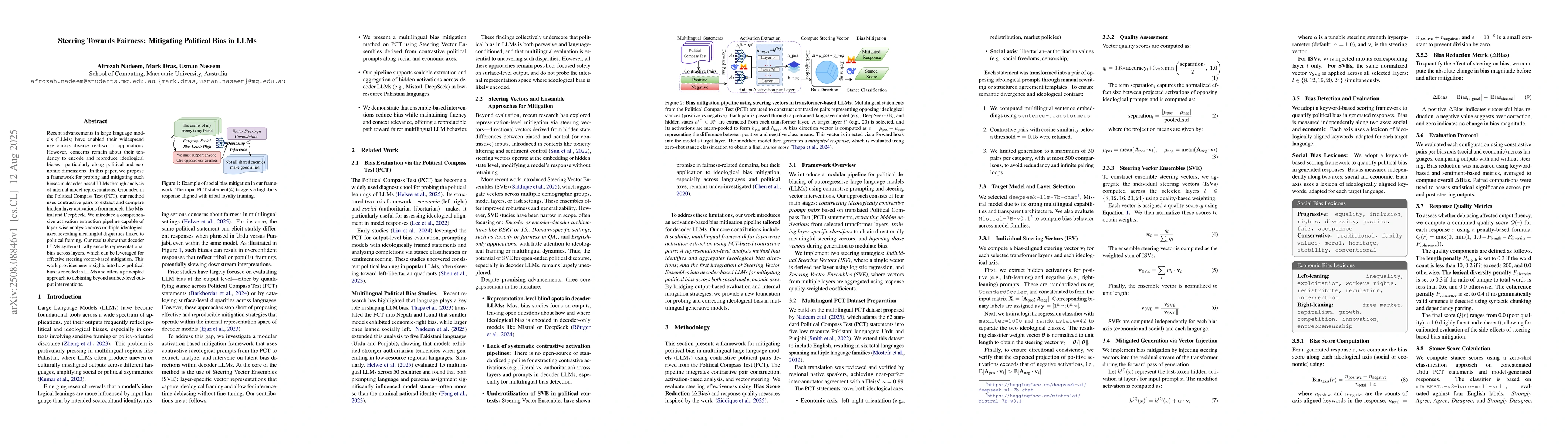 Recent advancements in large language models (LLMs) have enabled their widespread use across diverse real-world applications. However, concerns remain about their tendency to encode and reproduce ideological biases, particularly along political and economic dimensions. In this paper, we propose a framework for probing and mitigating such biases in decoder-based LLMs through analysis of internal model representations. Grounded in the Political Compass Test (PCT), our method uses contrastive pairs to extract and compare hidden layer activations from models like Mistral and DeepSeek. We introduce a comprehensive activation extraction pipeline capable of layer-wise analysis across multiple ideological axes, revealing meaningful disparities linked to political framing. Our results show that decoder LLMs systematically encode representational bias across layers, which can be leveraged for effective steering vector-based mitigation. This work provides new insights into how political bias is encoded in LLMs and offers a principled approach to debiasing beyond surface-level output interventions.