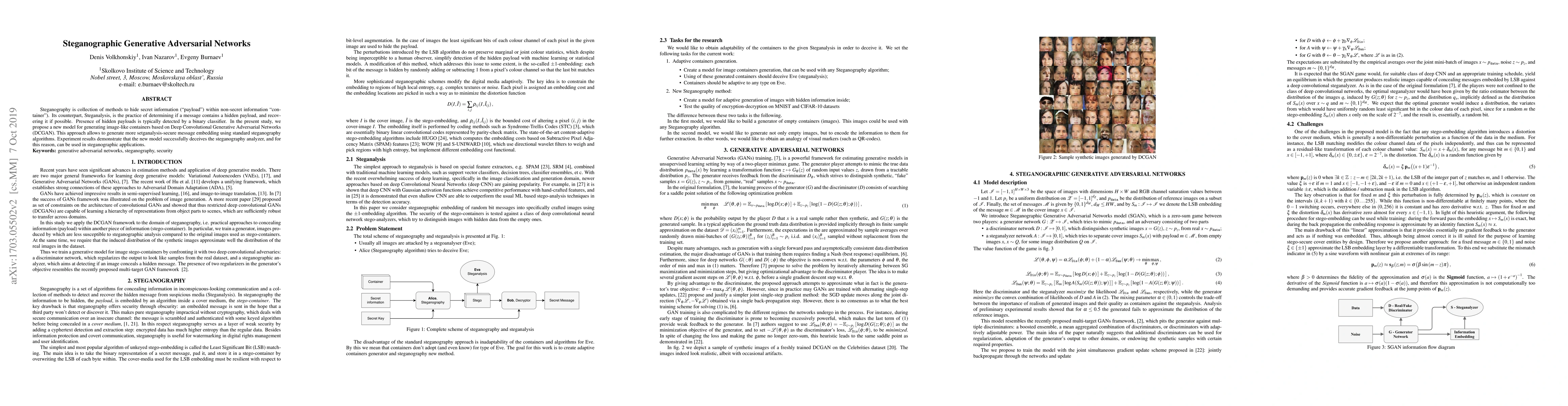 This paper proposes a novel model using Deep Convolutional Generative Adversarial Networks (DCGAN) to generate steganographic containers that are more secure against steganalysis. Experimental results show that the model effectively hides payloads, making it suitable for steganographic applications.