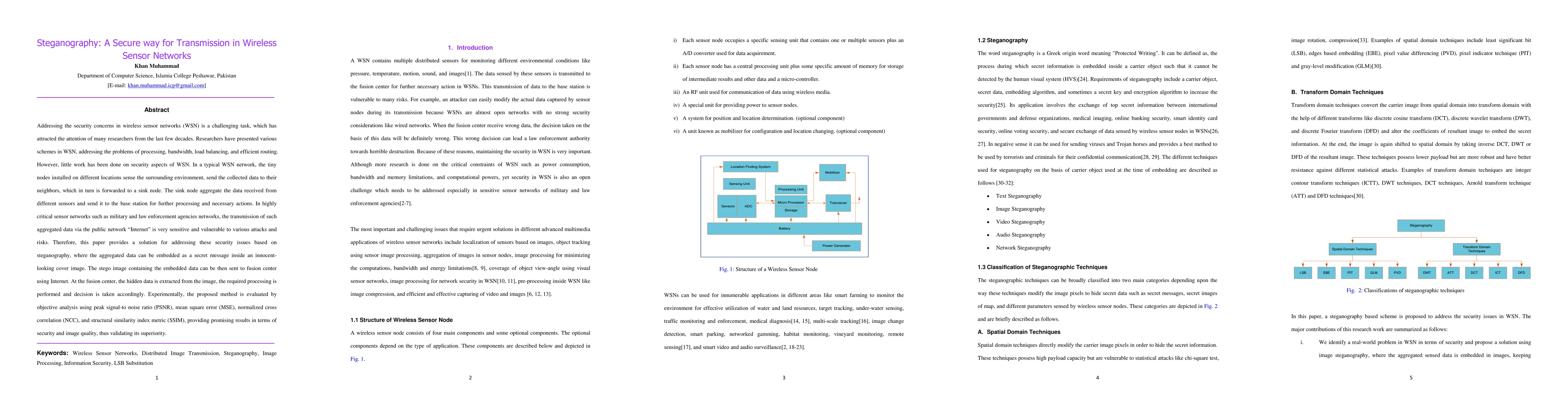 Addressing the security concerns in wireless sensor networks (WSN) is a challenging task, which has attracted the attention of many researchers from the last few decades. Researchers have presented various schemes in WSN, addressing the problems of processing, bandwidth, load balancing, and efficient routing. However, little work has been done on security aspects of WSN. In a typical WSN network, the tiny nodes installed on different locations sense the surrounding environment, send the collected data to their neighbors, which in turn is forwarded to a sink node. The sink node aggregate the data received from different sensors and send it to the base station for further processing and necessary actions. In highly critical sensor networks such as military and law enforcement agencies networks, the transmission of such aggregated data via the public network Internet is very sensitive and vulnerable to various attacks and risks. Therefore, this paper provides a solution for addressing these security issues based on steganography, where the aggregated data can be embedded as a secret message inside an innocent-looking cover image. The stego image containing the embedded data can be then sent to fusion center using Internet. At the fusion center, the hidden data is extracted from the image, the required processing is performed and decision is taken accordingly. Experimentally, the proposed method is evaluated by objective analysis using peak signal-to-noise ratio (PSNR), mean square error (MSE), normalized cross correlation (NCC), and structural similarity index metric (SSIM), providing promising results in terms of security and image quality, thus validating its superiority.
