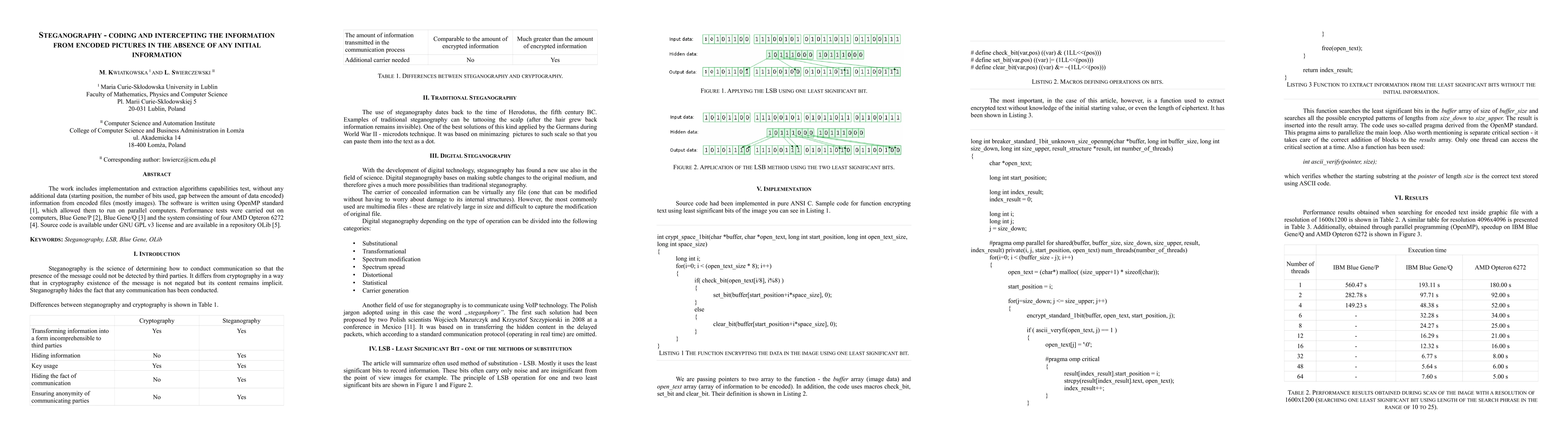 The work includes implementation and extraction algorithms capabilities test, without any additional data (starting position, the number of bits used, gap between the amount of data encoded) information from encoded files (mostly images). The software is written using OpenMP standard [1], which allowed them to run on parallel computers. Performance tests were carried out on computers, Blue Gene/P [2], Blue Gene/Q [3] and the system consisting of four AMD Opteron 6272 [4]. Source code is available under GNU GPL v3 license and are available in a repository OLib [5].