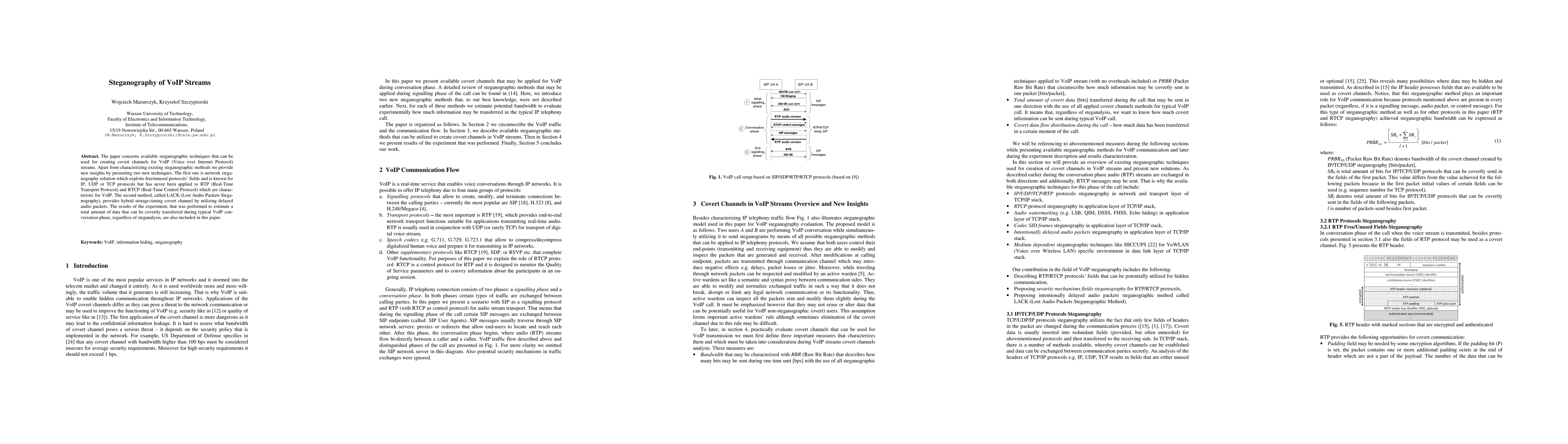 This paper explores steganographic techniques for embedding covert channels in VoIP streams, introducing two novel methods: a network steganography technique exploiting unused fields in RTP and RTCP protocols, and a hybrid storage-timing method called LACK that uses delayed audio packets. Experimental results estimate the amount of covert data that can be transferred during typical VoIP conversations.