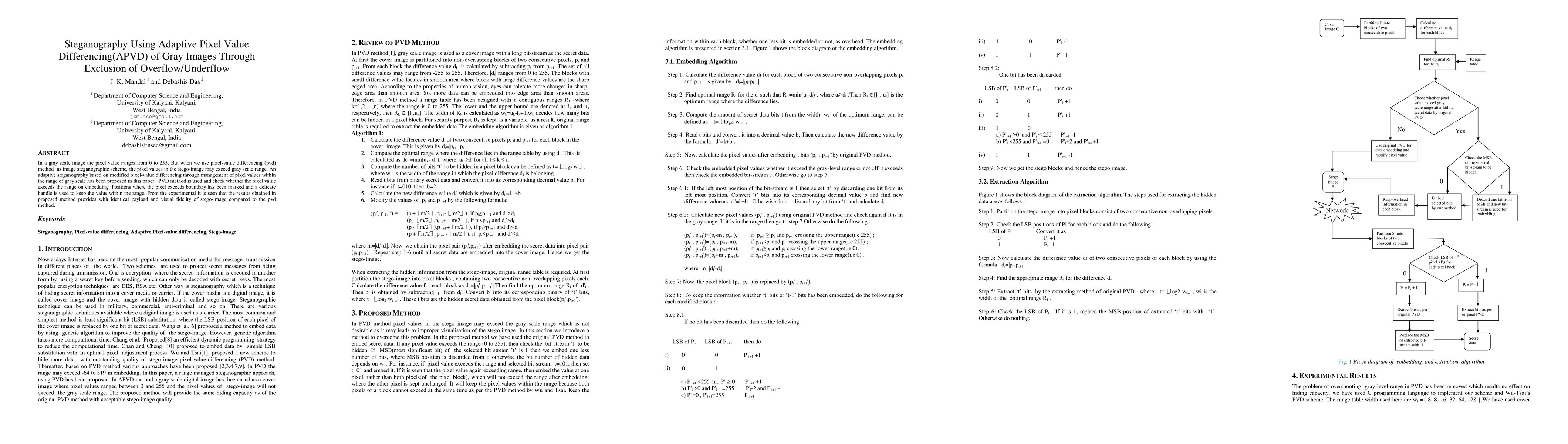This paper proposes an adaptive steganography method using modified pixel-value differencing (PVD) to embed data in grayscale images without exceeding pixel value ranges, ensuring no overflow or underflow. The method maintains payload and visual fidelity comparable to traditional PVD.