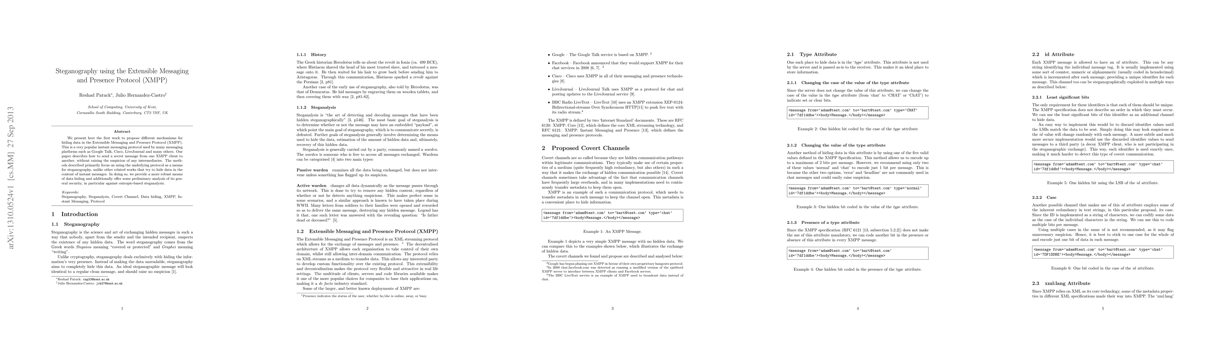 This paper introduces novel steganography techniques for hiding data within the Extensible Messaging and Presence Protocol (XMPP), focusing on leveraging the protocol's structure rather than message content. It provides a robust method for secret communication and offers preliminary security analysis against entropic-based steganalysis.