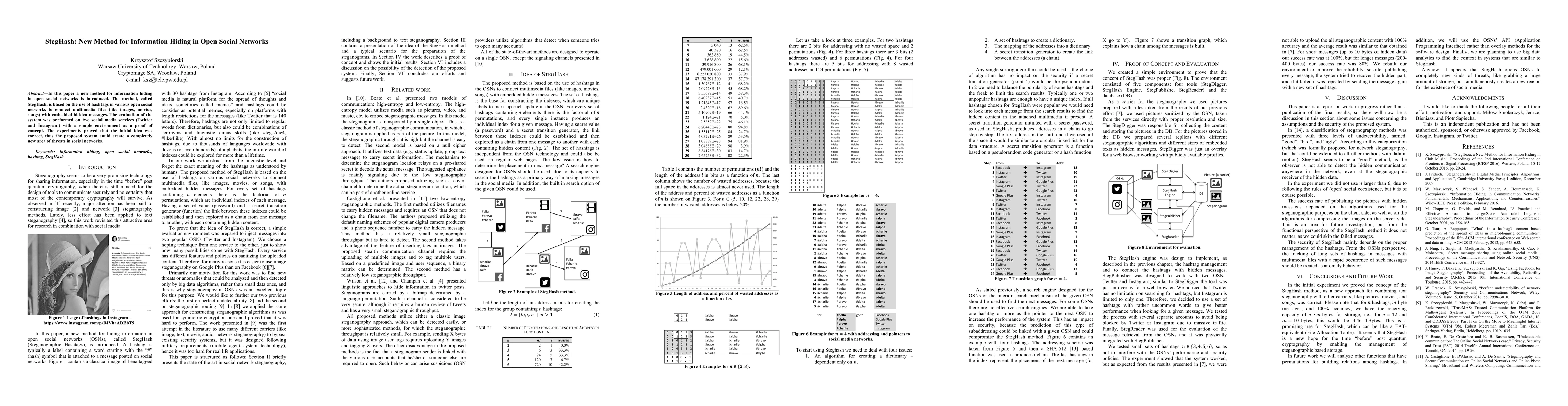 In this paper a new method for information hiding in open social networks is introduced. The method, called StegHash, is based on the use of hashtags in various open social networks to connect multimedia files (like images, movies, songs) with embedded hidden messages. The evaluation of the system was performed on two social media services (Twitter and Instagram) with a simple environment as a proof of concept. The experiments proved that the initial idea was correct, thus the proposed system could create a completely new area of threats in social networks.