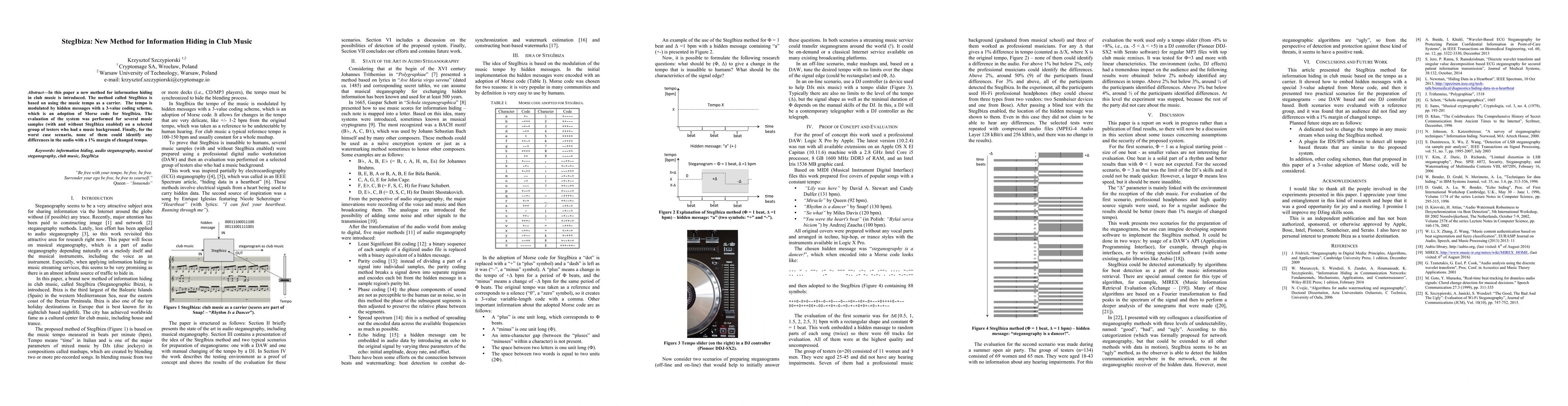 In this paper a new method for information hiding in club music is introduced. The method called StegIbiza is based on using the music tempo as a carrier. The tempo is modulated by hidden messages with a 3-value coding scheme, which is an adoption of Morse code for StegIbiza. The evaluation of the system was performed for several music samples (with and without StegIbiza enabled) on a selected group of testers who had a music background. Finally, for the worst case scenario, none of them could identify any differences in the audio with a 1% margin of changed tempo.