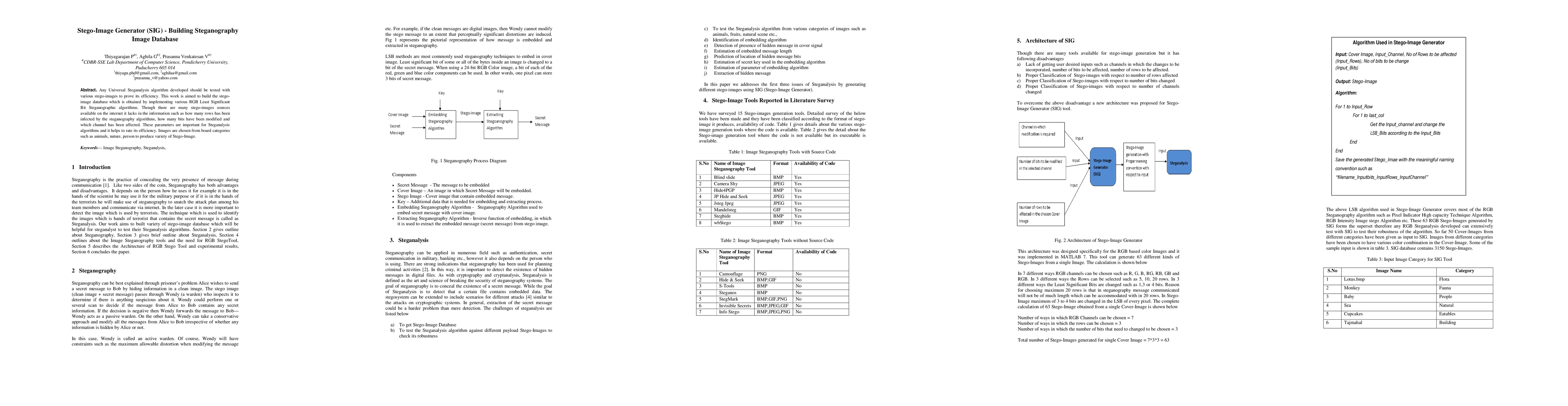 This paper aims to create a comprehensive stego-image database using various RGB Least Significant Bit Steganographic algorithms, providing detailed metadata on modifications to aid in the evaluation of Steganalysis algorithms. The database includes images from diverse categories like animals, nature, and people to ensure a wide range of test cases.
