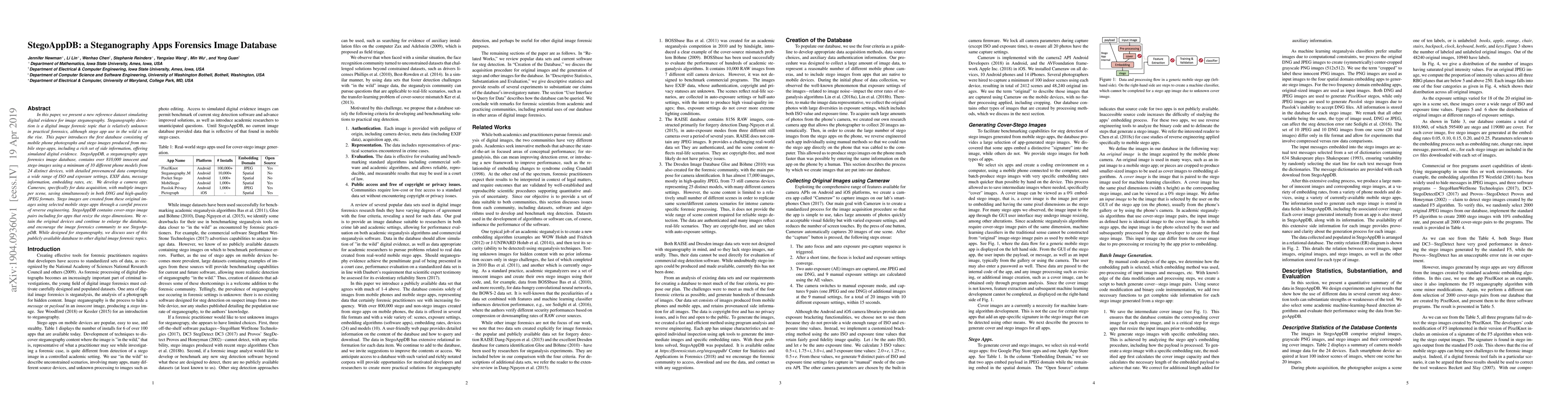 StegoAppDB is a new forensics image database simulating digital evidence for image steganography, featuring over 810,000 images from 24 devices, including detailed metadata and reverse-engineered stego images created using mobile steganography apps. The database aims to enhance steganography detection research and can also support broader digital image forensic studies.
