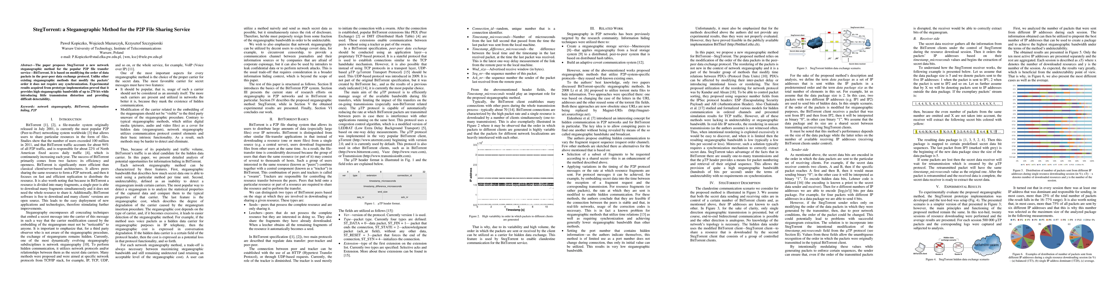 The paper proposes StegTorrent a new network steganographic method for the popular P2P file transfer service-BitTorrent. It is based on modifying the order of data packets in the peer-peer data exchange protocol. Unlike other existing steganographic methods that modify the packets' order it does not require any synchronization. Experimental results acquired from prototype implementation proved that it provides high steganographic bandwidth of up to 270 b/s while introducing little transmission distortion and providing difficult detectability.