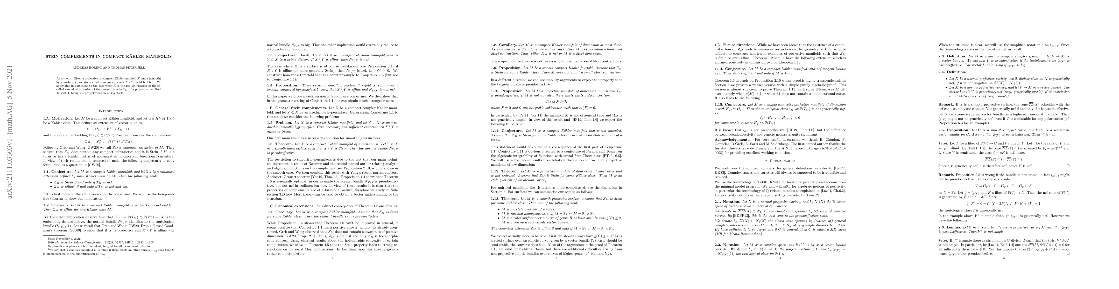 Given a projective or compact K\"ahler manifold X and a (smooth) hypersurface Y, we study conditions under which $X \setminus Y$ could be Stein. We apply this in particular to the case when X is the projectivization of the so-called canonical extension of the tangent bundle $T_M$ of a projective manifold M with Y being the projectivization of $T_M$ itself.