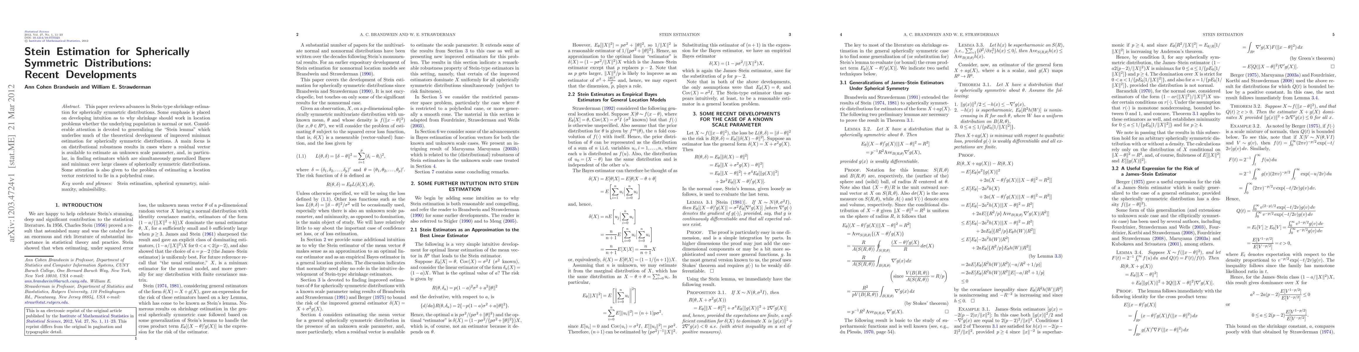 This paper reviews advances in Stein-type shrinkage estimation for spherically symmetric distributions. Some emphasis is placed on developing intuition as to why shrinkage should work in location problems whether the underlying population is normal or not. Considerable attention is devoted to generalizing the "Stein lemma" which underlies much of the theoretical development of improved minimax estimation for spherically symmetric distributions. A main focus is on distributional robustness results in cases where a residual vector is available to estimate an unknown scale parameter, and, in particular, in finding estimators which are simultaneously generalized Bayes and minimax over large classes of spherically symmetric distributions. Some attention is also given to the problem of estimating a location vector restricted to lie in a polyhedral cone.