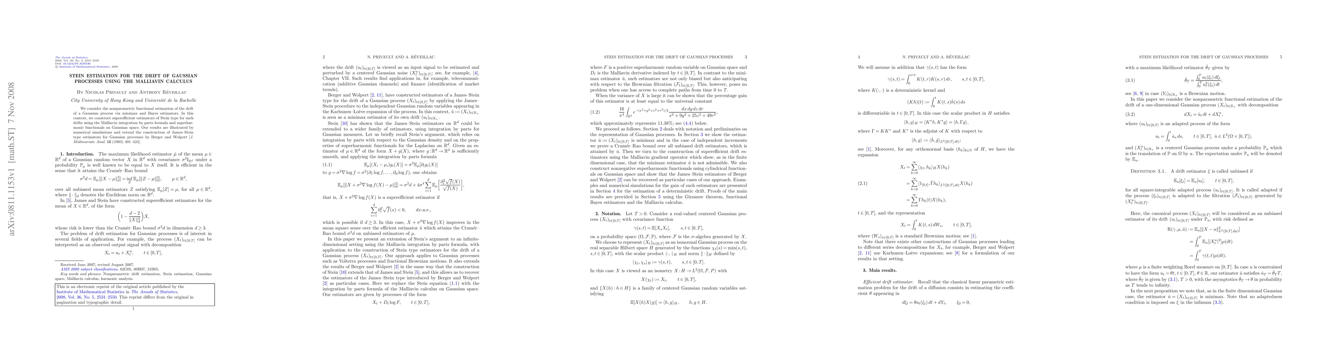 We consider the nonparametric functional estimation of the drift of a Gaussian process via minimax and Bayes estimators. In this context, we construct superefficient estimators of Stein type for such drifts using the Malliavin integration by parts formula and superharmonic functionals on Gaussian space. Our results are illustrated by numerical simulations and extend the construction of James--Stein type estimators for Gaussian processes by Berger and Wolpert [J. Multivariate Anal. 13 (1983) 401--424].