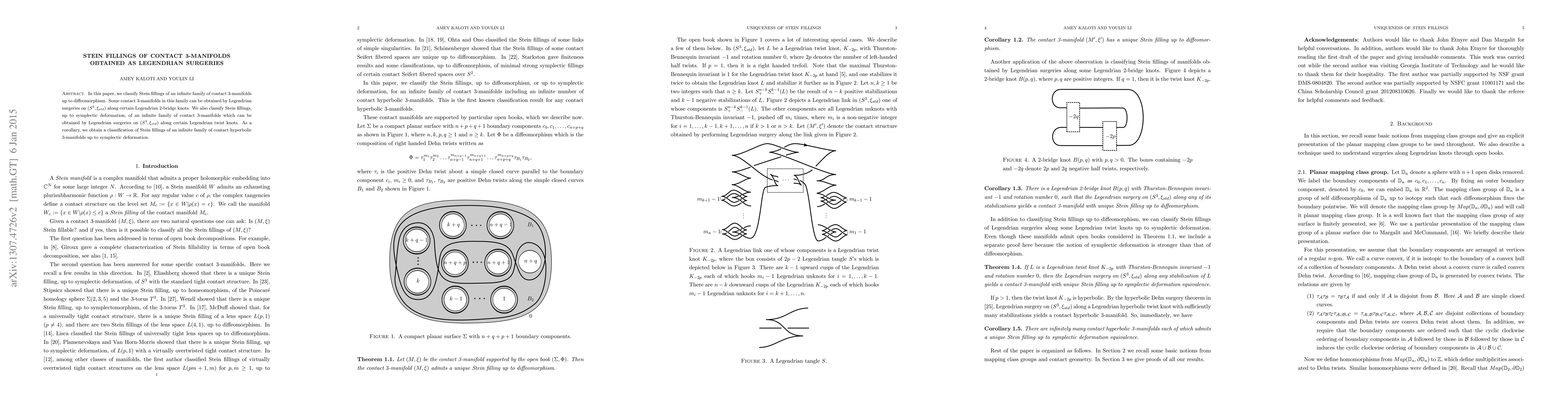 This paper classifies Stein fillings of an infinite family of contact 3-manifolds obtained via Legendrian surgeries on the standard contact structure of $S^3$. It provides a comprehensive classification up to diffeomorphism and symplectic deformation, including those derived from 2-bridge and twist knots.