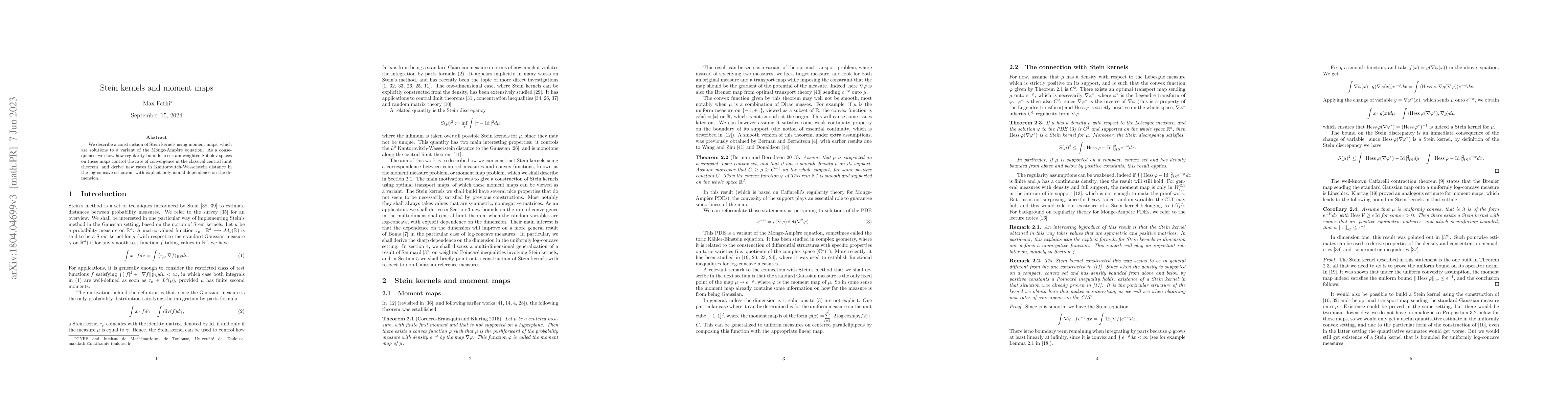 This paper constructs Stein kernels via moment maps, which solve a variant of the Monge-Ampère equation. It demonstrates that regularity bounds on these maps influence the convergence rates in the central limit theorem and establishes new rates in Kantorovitch-Wasserstein distance for log-concave distributions with explicit polynomial dimension dependence.