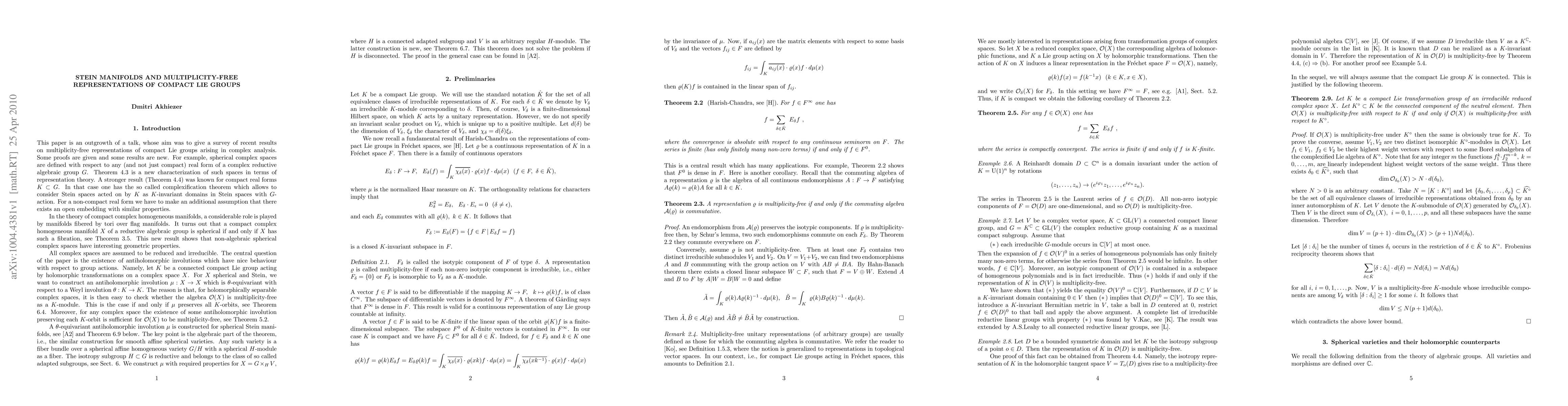 The paper is a survey of recent results in geometric representation theory describing group actions which induce multiplicity-free representations in the spaces of holomorphic functions. For connected compact Lie groups of automorphisms of Stein manifolds we characterize such actions in terms of antiholomorphic involutions. Some proofs are given and some results are new. For example, spherical complex spaces are defined for arbitrary real forms of complex reductive groups. Their properties, which we prove here, were known only for compact real forms. We also show that a complex compact homogeneous manifold of a complex reductive group is spherical if and only if the fiber of its Tits fibration is a complex torus.