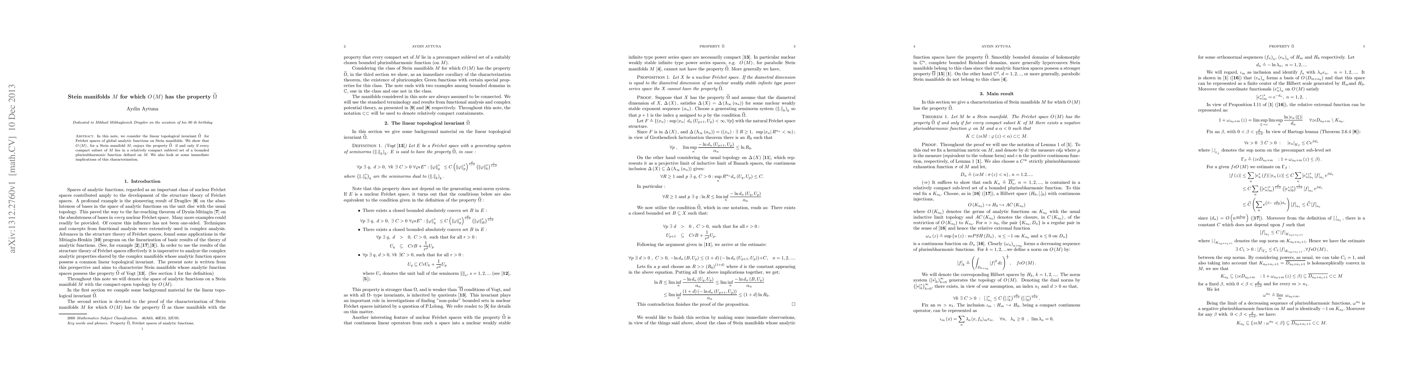 In this note, we consider the linear topological invariant {\Omega}-tilda for Fr\'echet spaces of global analytic functions on Stein manifolds. We show that O(M), for a Stein manifold M, enjoys the property {\Omega}-tilda if and only if every compact subset of M lies in a relatively compact sublevel set of a bounded plurisubharmonic function defined on M. We also look at some immediate implications of this characterization.
