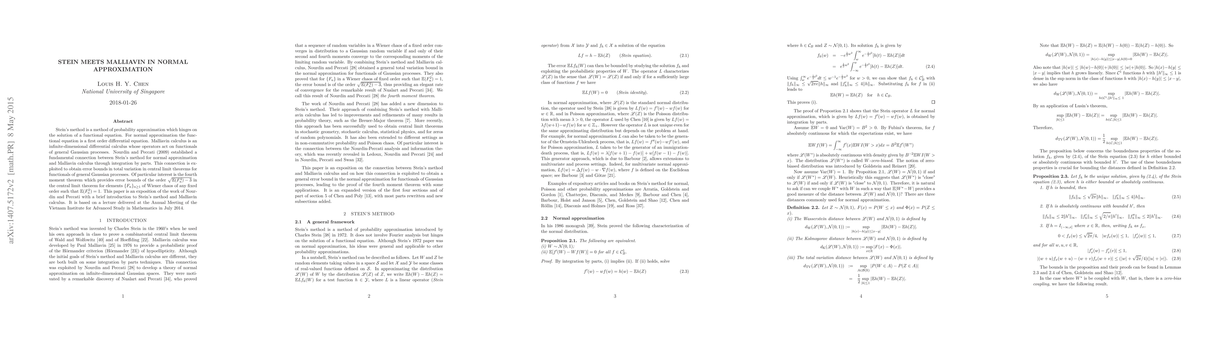 This paper explores the connection between Stein's method for normal approximation and Malliavin calculus, demonstrating how integration by parts can yield error bounds in central limit theorems for Gaussian processes. It particularly highlights the fourth moment theorem, providing error bounds of the order $\sqrt{\mathbb{E}(F_n^4)-3}$ for Wiener chaos elements.