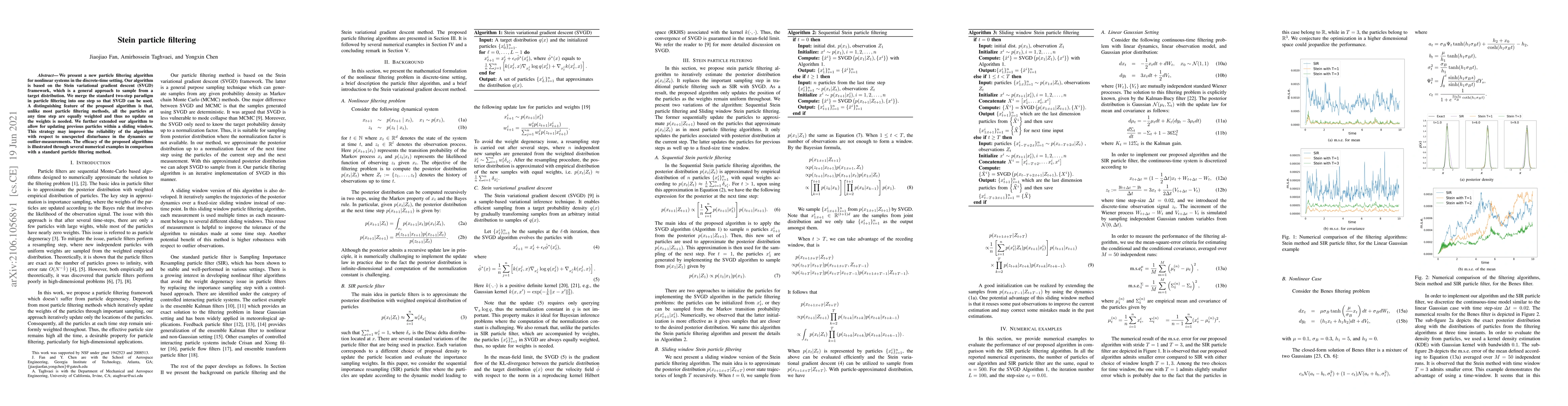We present a new particle filtering algorithm for nonlinear systems in the discrete-time setting. Our algorithm is based on the Stein variational gradient descent (SVGD) framework, which is a general approach to sample from a target distribution. We merge the standard two-step paradigm in particle filtering into one step so that SVGD can be used. A distinguishing feature of the proposed algorithm is that, unlike most particle filtering methods, all the particles at any time step are equally weighted and thus no update on the weights is needed. We further extended our algorithm to allow for updating previous particles within a sliding window. This strategy may improve the reliability of the algorithm with respect to unexpected disturbance in the dynamics or outlier-measurements. The efficacy of the proposed algorithms is illustrated through several numerical examples in comparison with a standard particle filtering method.