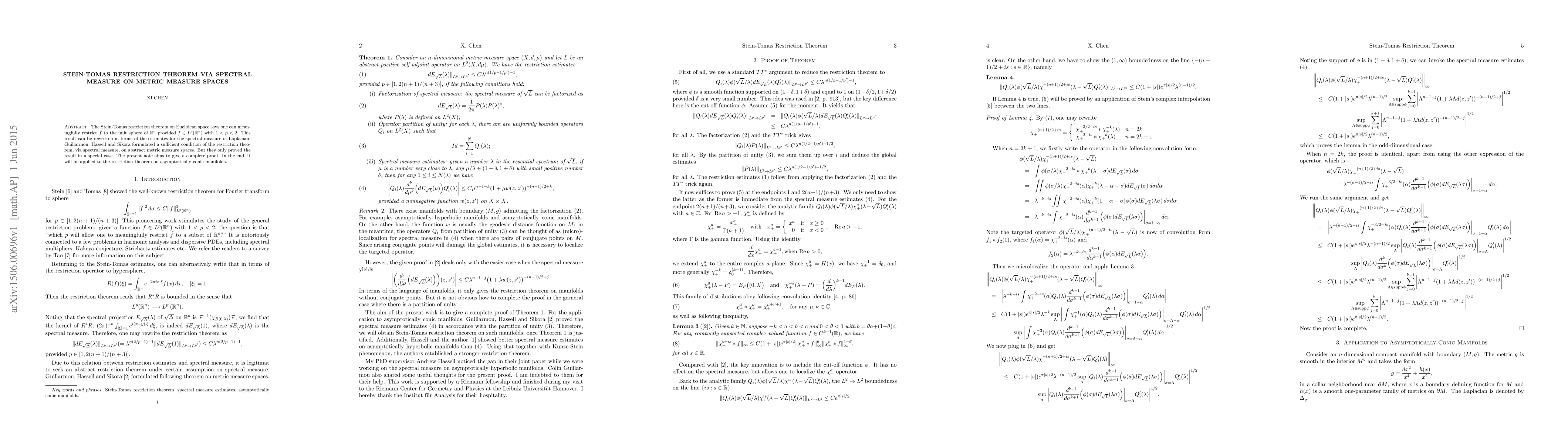 This paper provides a complete proof of the Stein-Tomas restriction theorem on abstract metric measure spaces using spectral measure, extending previous work by Guillarmou, Hassell, and Sikora. The result is then applied to the restriction theorem on asymptotically conic manifolds.