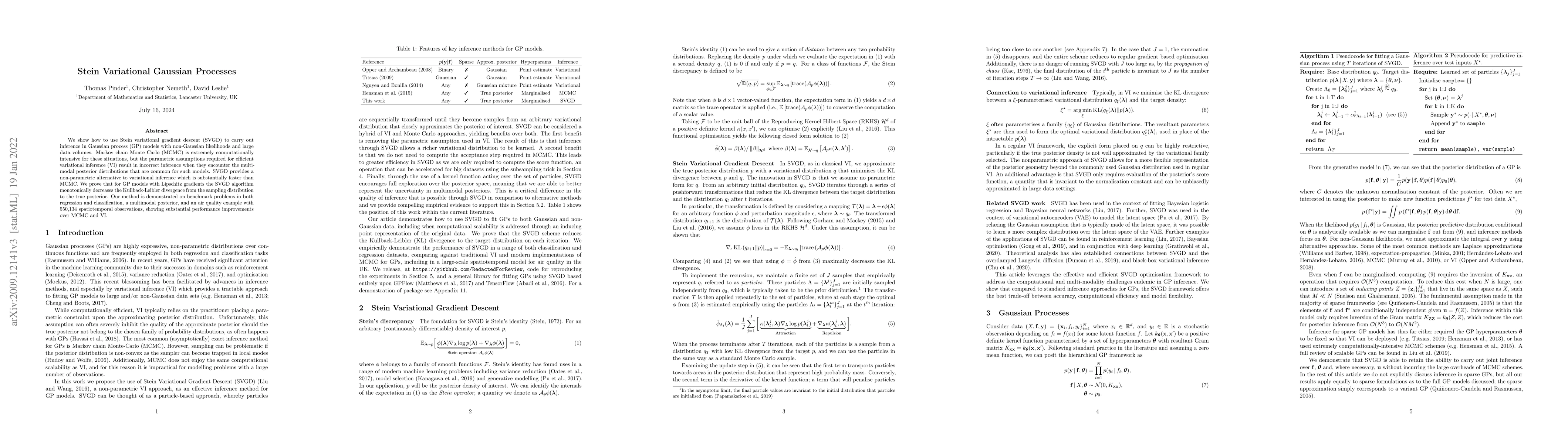 This paper introduces Stein variational gradient descent (SVGD) for efficient inference in Gaussian process models with non-Gaussian likelihoods and large datasets. SVGD offers a non-parametric alternative to variational inference, providing faster and more accurate results compared to Markov chain Monte Carlo, especially for multi-modal posterior distributions.